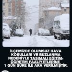 Keban Kaymakamlığından yapılan açıklamada ise, “İlçemizde olumsuz hava şartlarını ve buzlanma nedeniyle taşımalı eğitim-öğretim faaliyetlerine 1 gün süre ile ara verilmiştir” ifadelerine yer verildi.