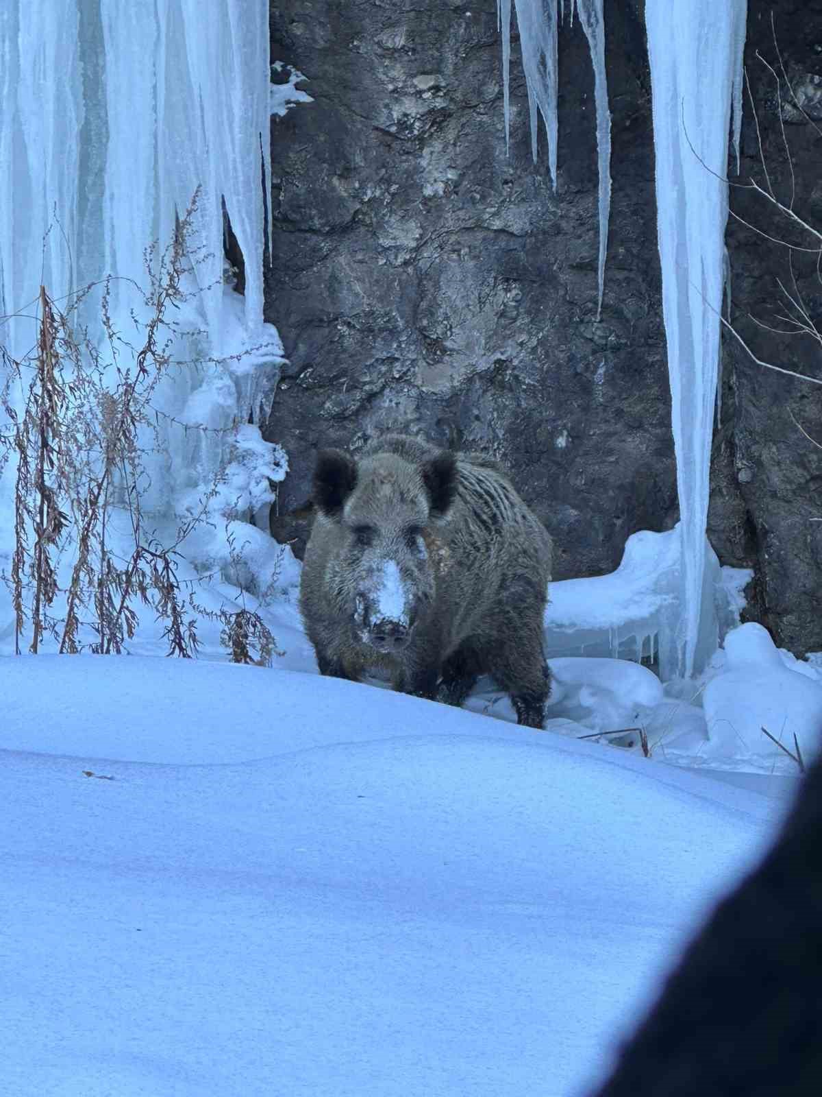 Öte yandan kar temizleme çalışmalarını tamamlayarak dönüş yapan ekipler, yol üzerinde bir yaban domuzuyla karşılaştı. Araca yol vermeyen domuz cep telefonu kamerasıyla kaydedildi.