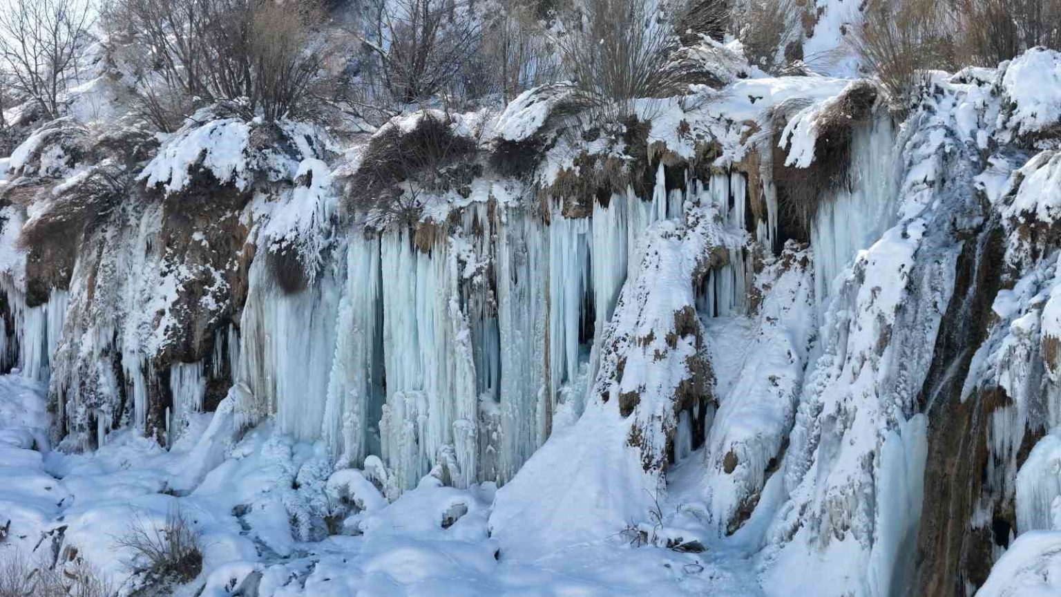 Girlevik Şelalesi buz tuttu, 2 metrelik buz sarkıtları oluştu.
