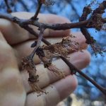 Zirai donun etkisiyle kayısı ağaçlarının beyaz çiçek yapraklarının uç kısımlarında kahverengiye dönüşüm gözlemlendi. Ağaç dallarındaki bu renk değişimi, don olayının etkisini ortaya koydu.