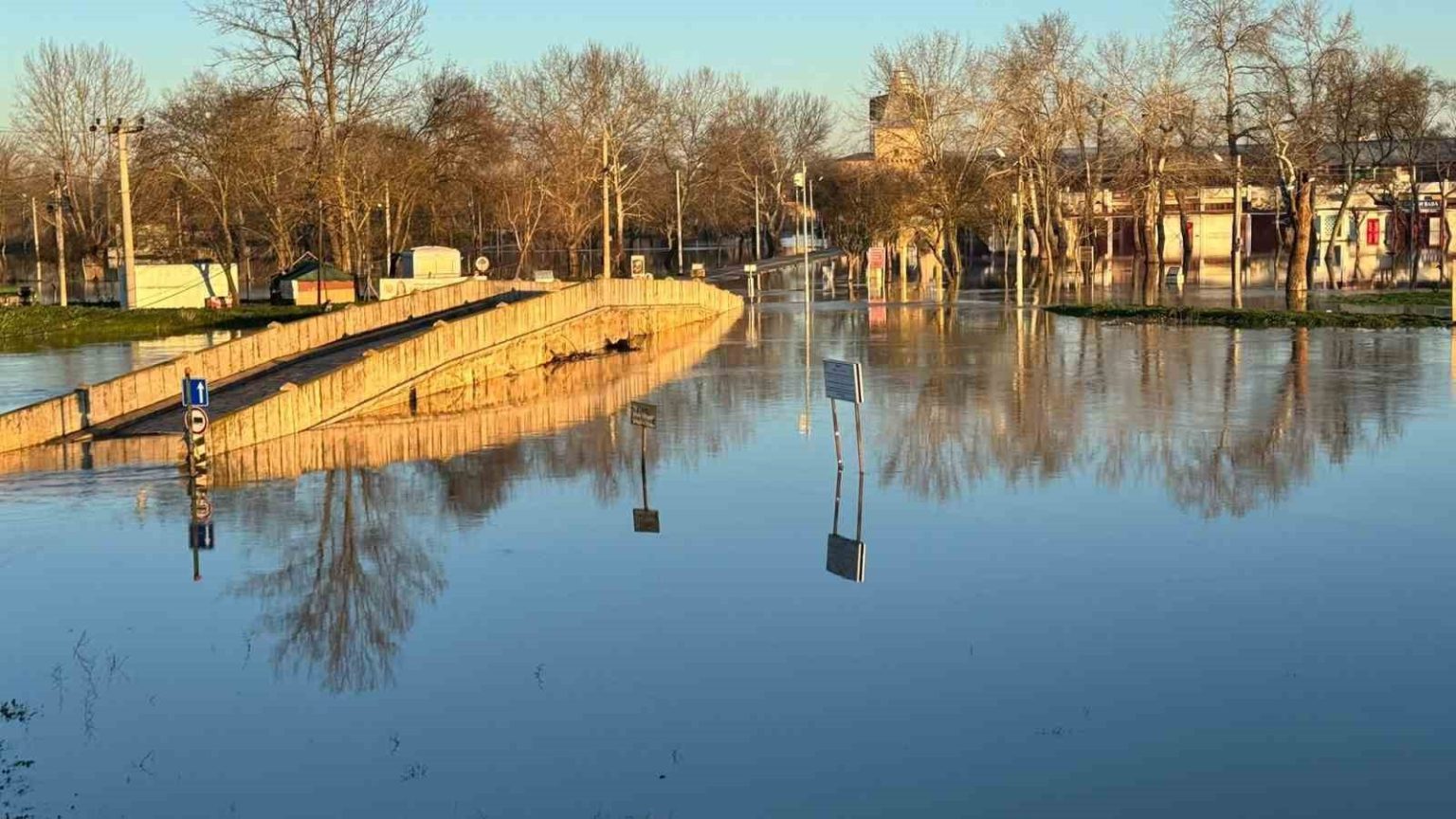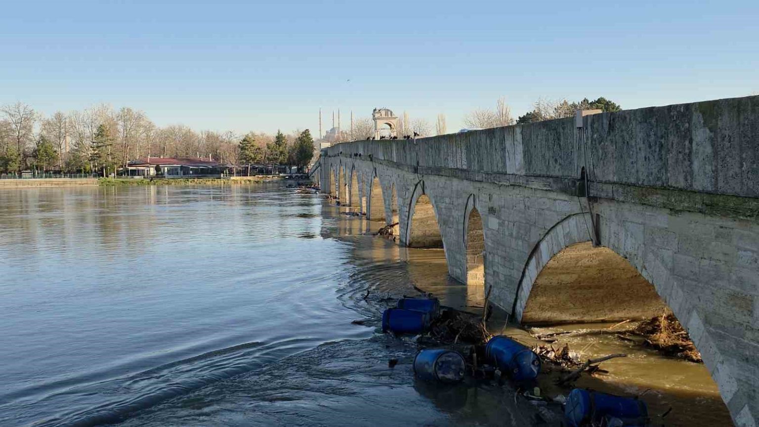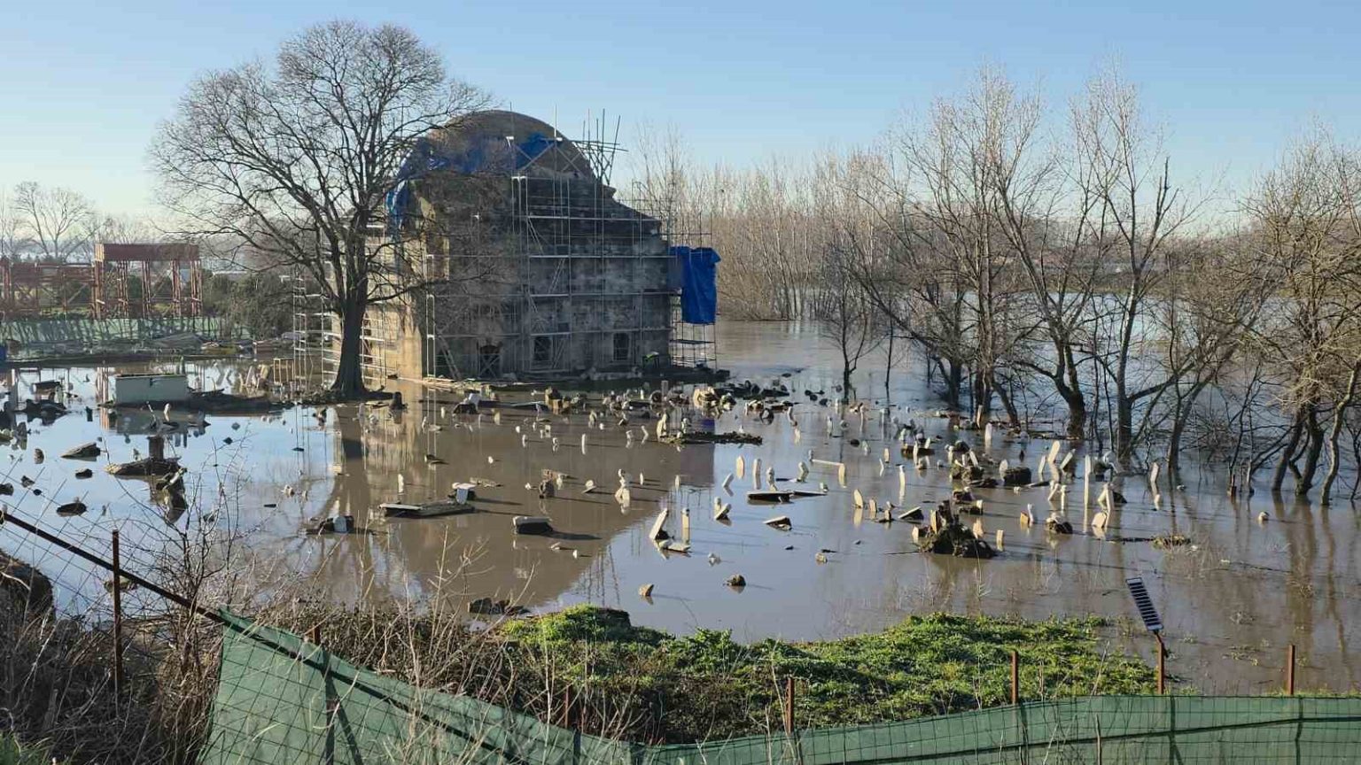 Edirne’de son günlerde etkili olan yağışların ardından Tunca Nehri’nde su seviyesi yükseldi. Artan debi nedeniyle Evliya Kasım Paşa Camii restorasyon şantiyesinin bir bölümü sular altında kaldı.