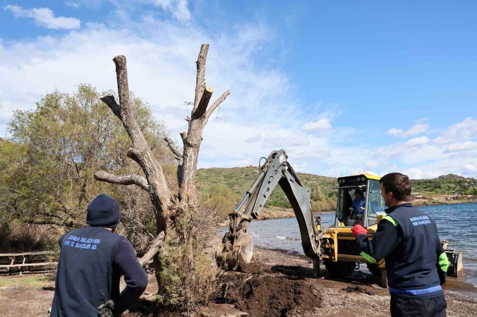 Belediye ekipleri, Bodrum’da fırtınada devrilen ılgın ağaçlarını tekniğine uygun şekilde budayarak bulundukları alana yeniden dikiyor.