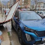 Fırtınanın etkisiyle yapıdan kopan parça araca zarar verdi