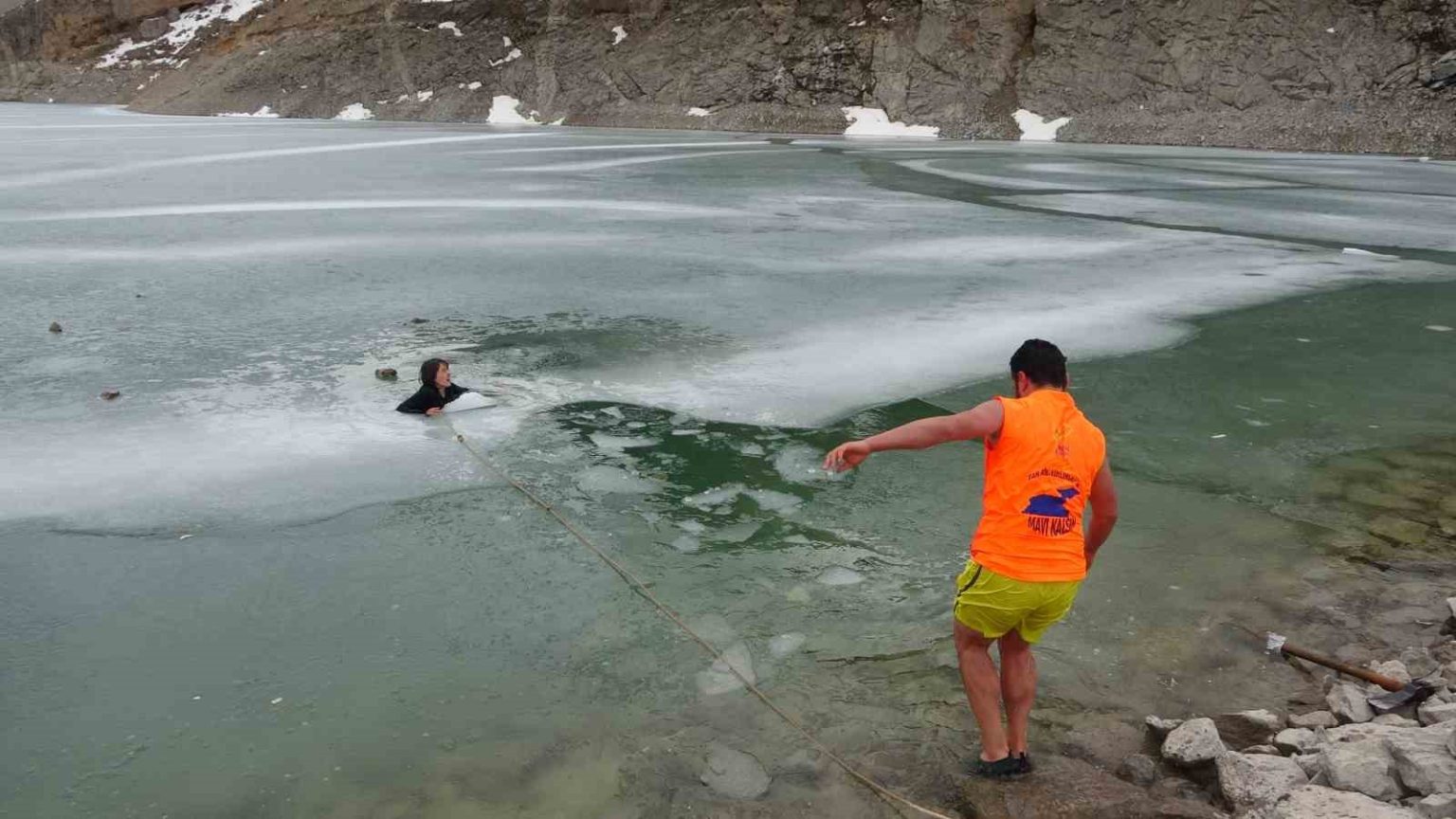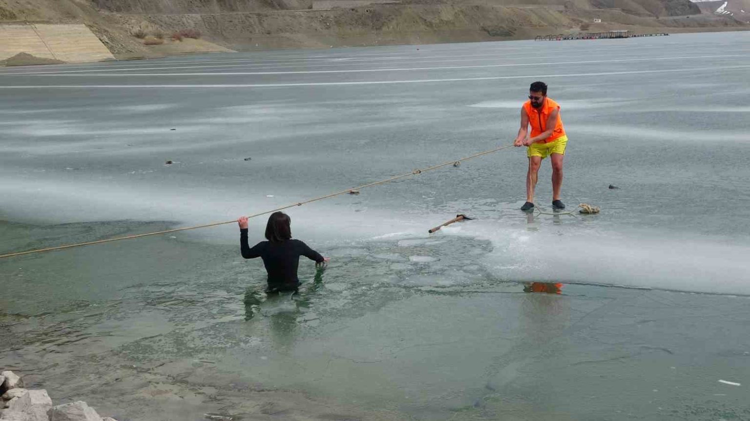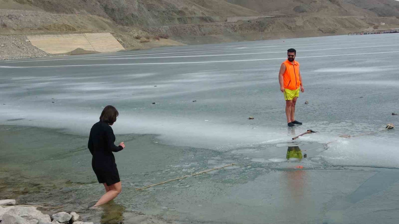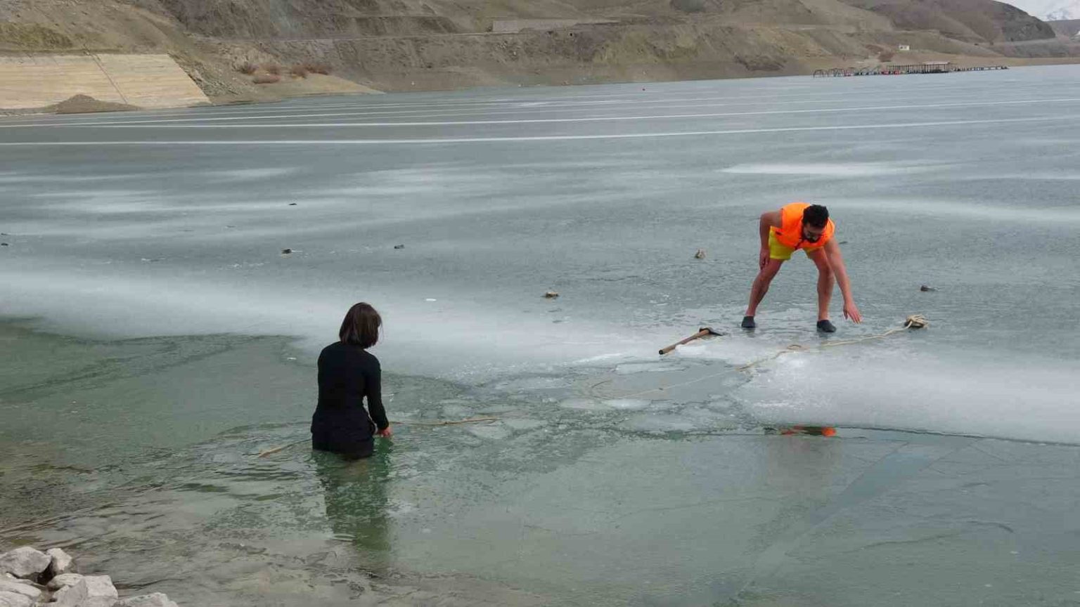 Van’da gerçekleştirdiği sıra dışı etkinliklerle tanınan gezgin ve maceracı öğretmen, bu kez dondurucu soğuklara aldırış etmeden Zernek Barajı kıyısından temiz bir Van Gölü için çağrıda bulundu.