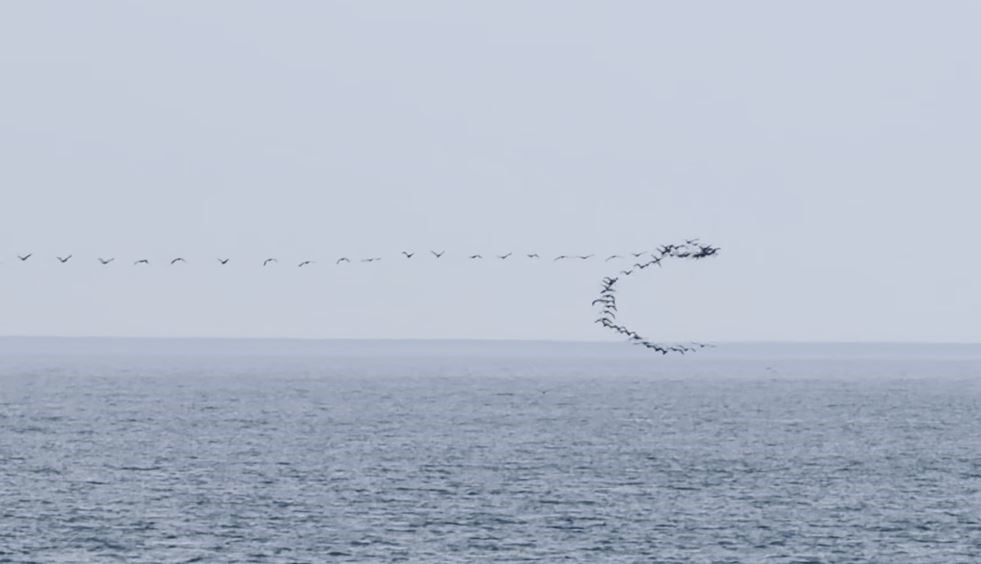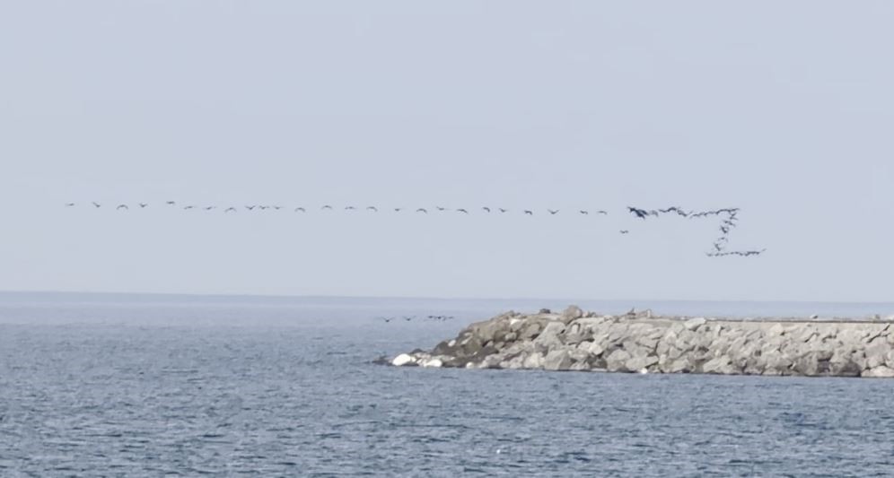 Artvin’in Hopa ilçesinde kaydedilen görüntüler, Karadeniz kıyı hattındaki göçmen kuş hareketliliğini bir kez daha görüntülendi. Göç yolculuğu sırasında göçmen kuşların sergilediği senkronize uçuş hareketleri, Hopa açıklarında deniz yüzeyine yakın şekilde görüntülendi.