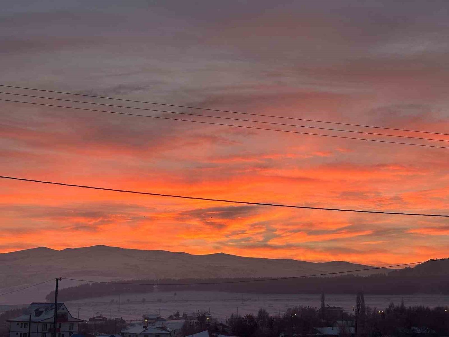 Ardahan’da gün doğumuyla kızıla bürünen gökyüzü görsel şölen oluşturdu.
