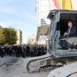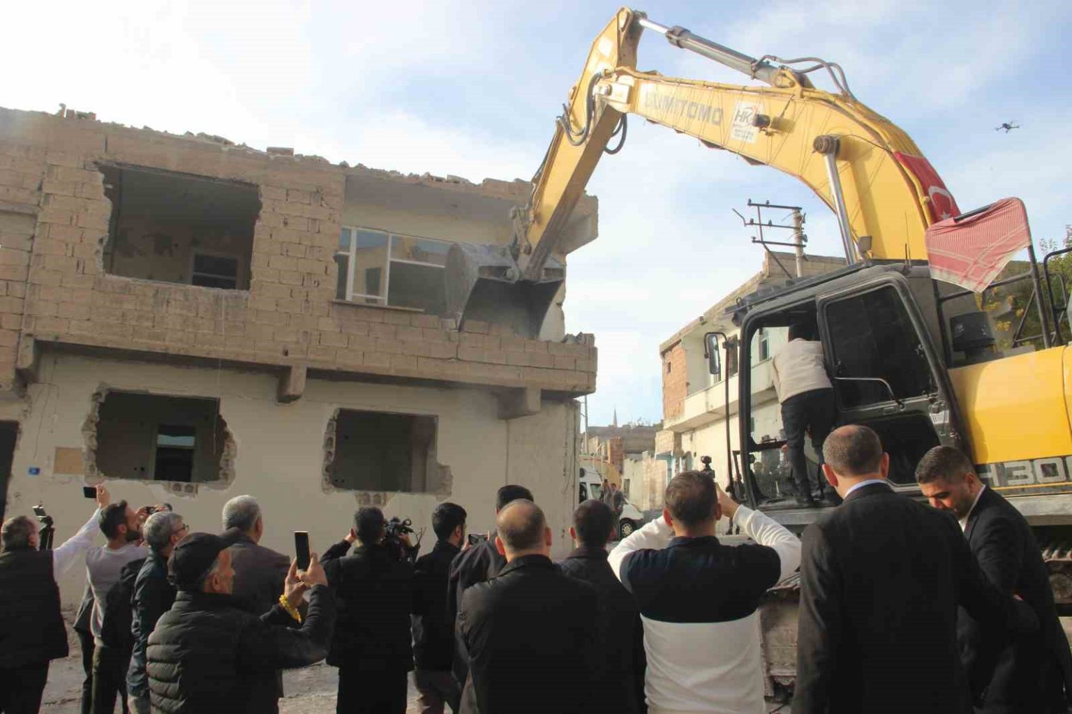 Açıklama ve incelemelerinin ardından kepçe operatörünün koltuğuna geçen Gülpınar, bina yıkımları için ilk kepçeyi vurarak çalışmaları başlattı.