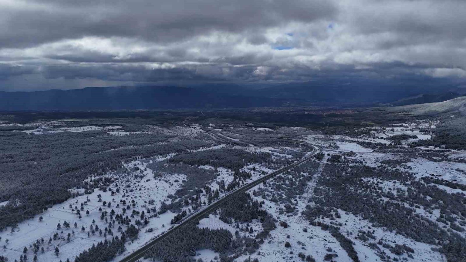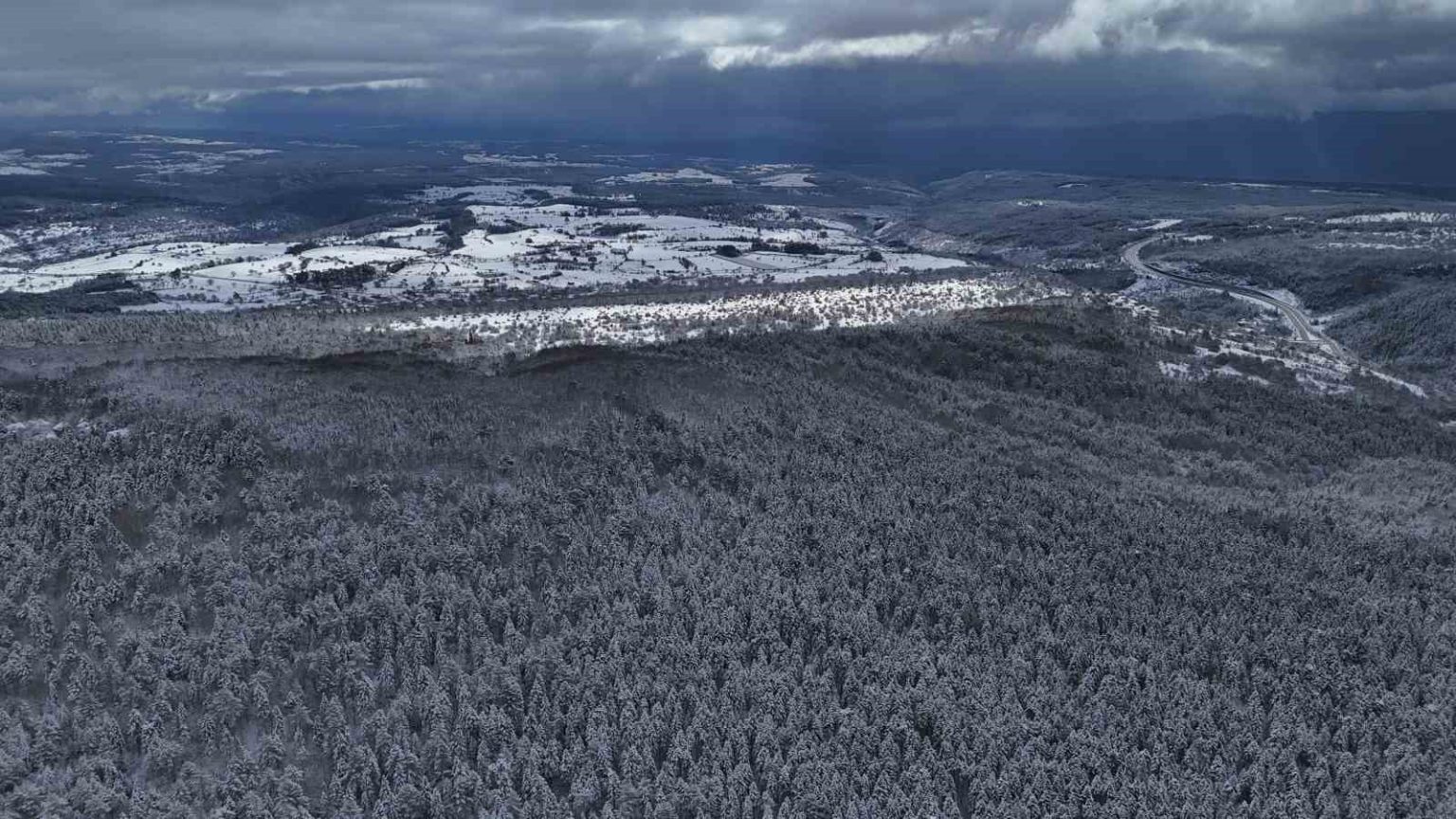 Karabük’ün yüksek kesimlerinde kar yağışı sonrası oluşan beyaz örtü, güneşin açmasıyla birlikte eşsiz manzaralar oluştururken o anlar dronla görüntülendi.