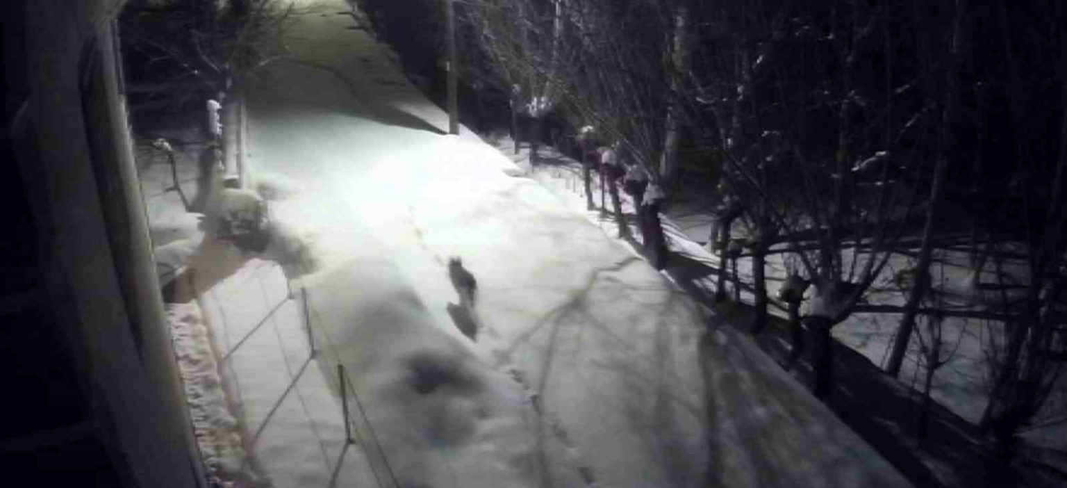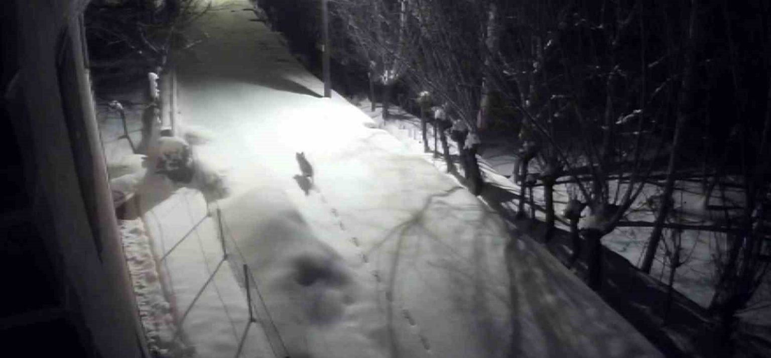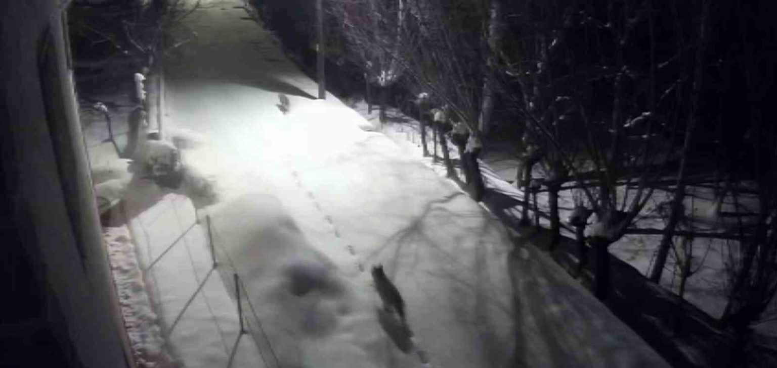 Sert kış şartları nedeniyle kırsalda besin bulmakta güçlük çekip şehir merkezine inen kurtlar, bir evin güvenlik kamerasına yansıdı.