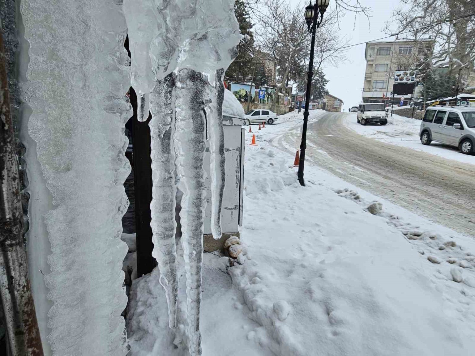 Elazığ’da kar yağışı ve soğuk hava etkisini sürdürüyor. Gece boyunca termometre eksi 10 dereceye kadar düşmeye başladı. Etkili olan don nedeniyle birçok evin çatısında yaklaşık bir metre uzunluğunda buz sarkıtları oluştu. Oluşan buz sarkıtları, hem görsel bir manzara oluşturdu hem de vatandaşlar için tehlike arz etti.