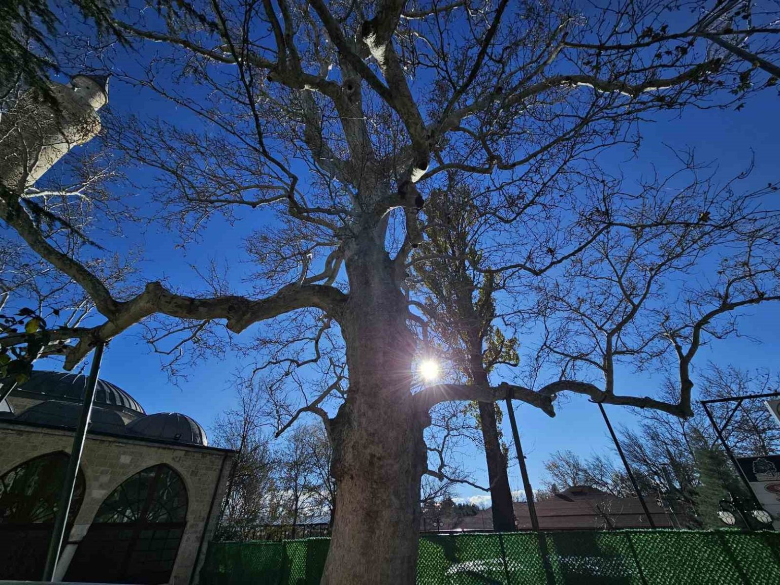 Kurşunlu Camii bahçesinde bulunan çınar ağacı, 300 yılı aşkın süredir zamana meydan okurken, kış aylarında da farklı bir güzelliğe bürünüyor.