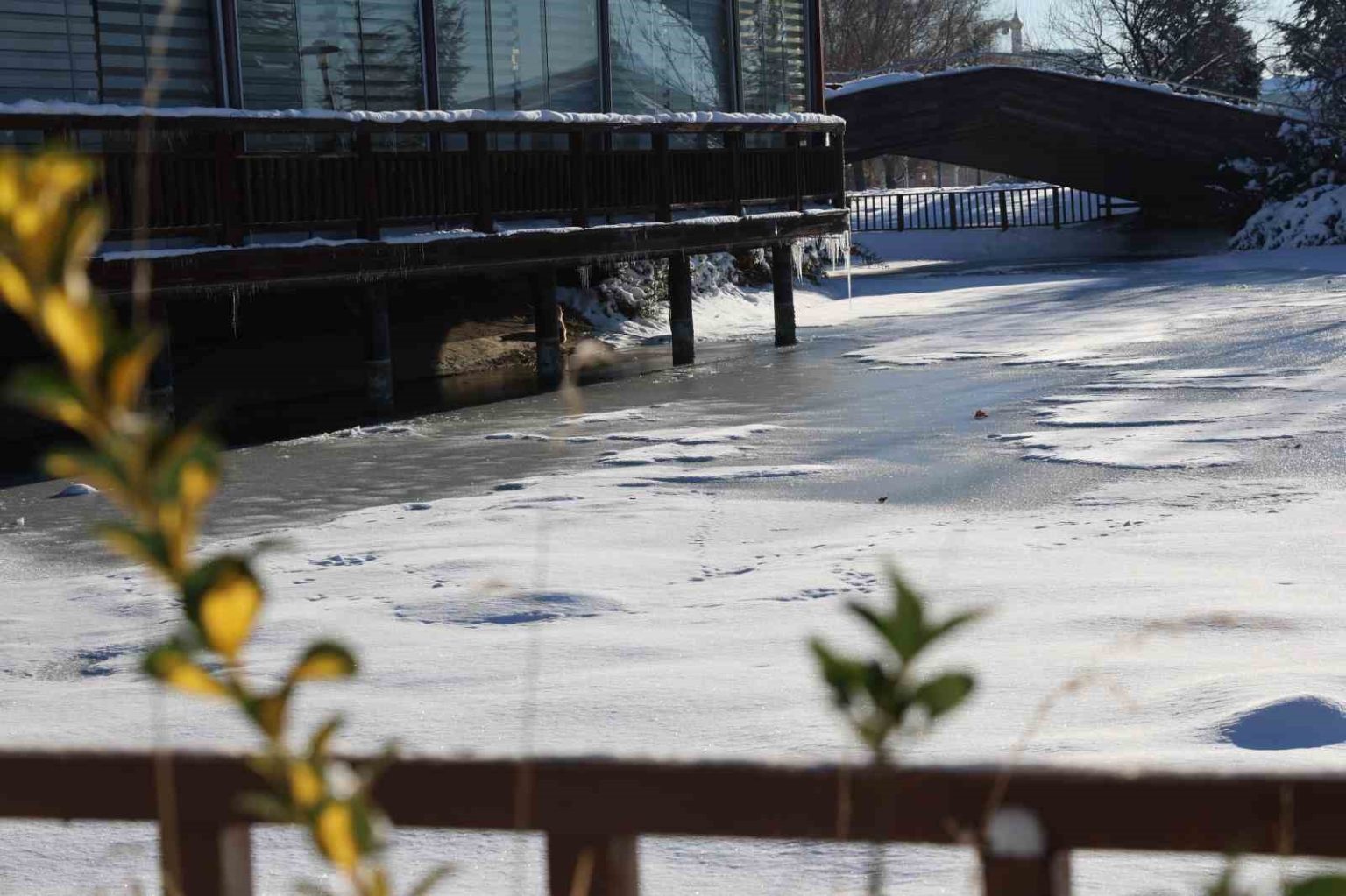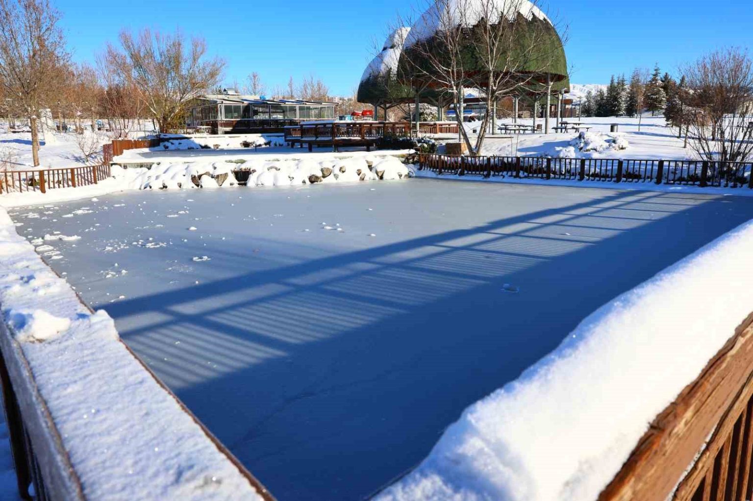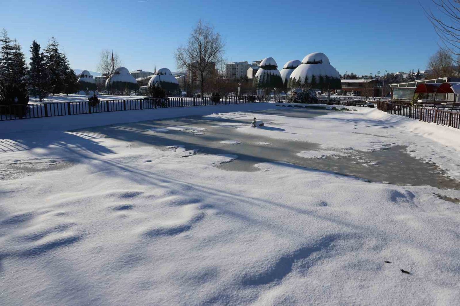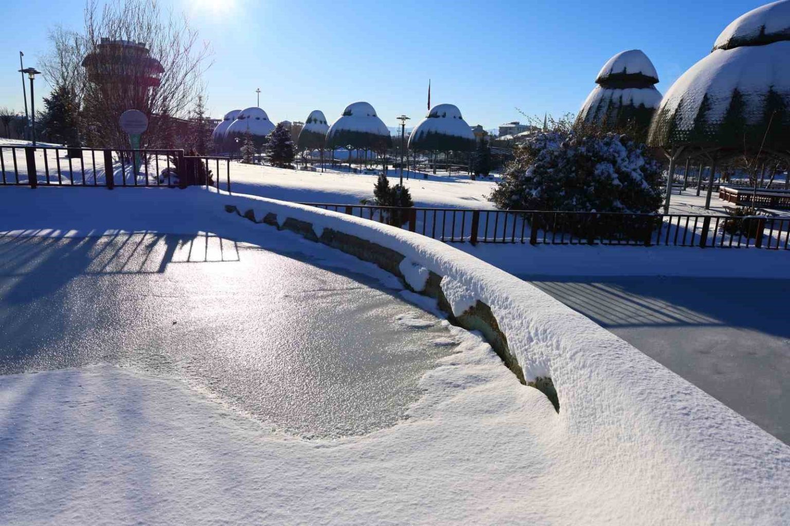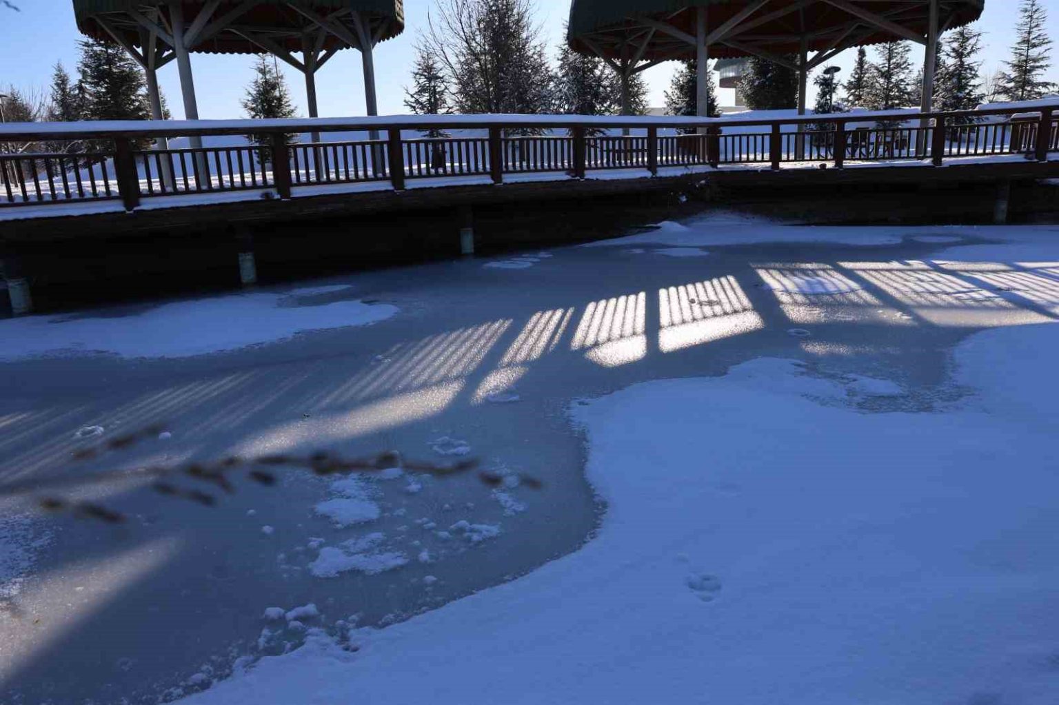 Hava sıcaklıklarının eksi 13’ü gördüğü kentte süs havuzları dondu