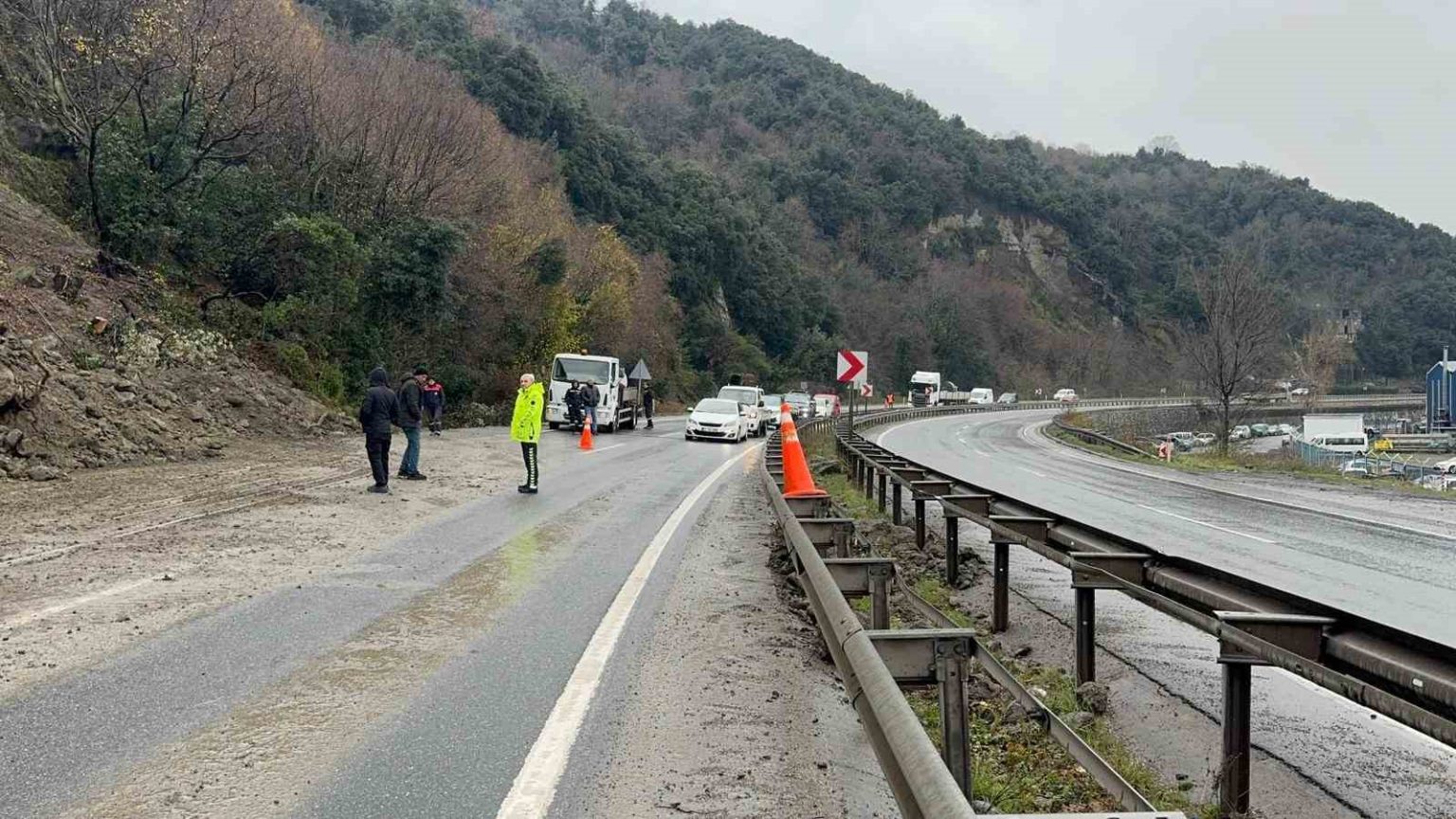Edinilen bilgiye göre, heyelan sabah 07.40 sıralarında yaşandı. Karadeniz Ereğli ilçesi ile Alaplı ilçesini birbirine bağlayan kara yolu Tersaneler mevkiinde yağışlarla birlikte yamaçtan kopan toprak ve kaya parçaları yolu kapattı.