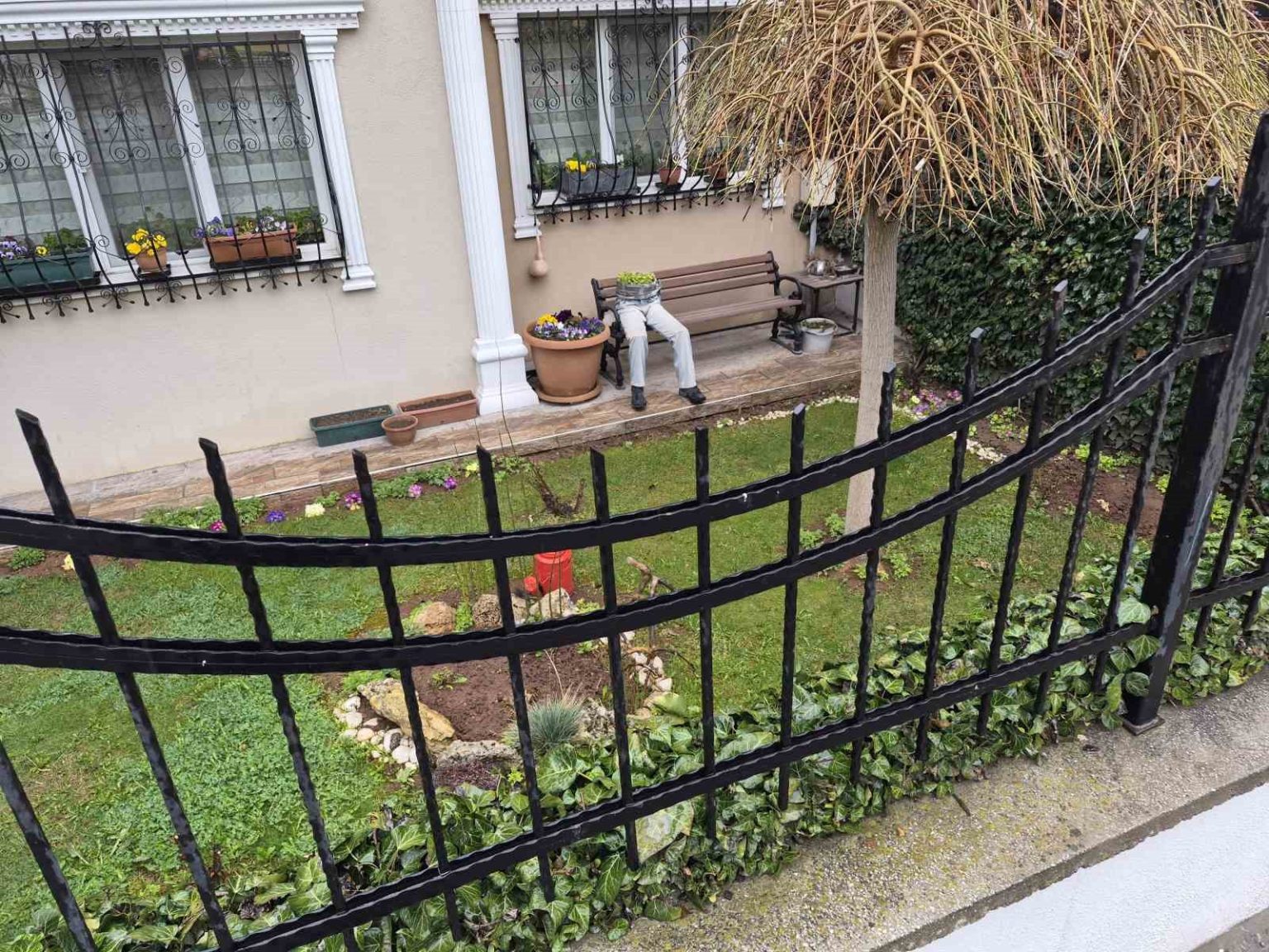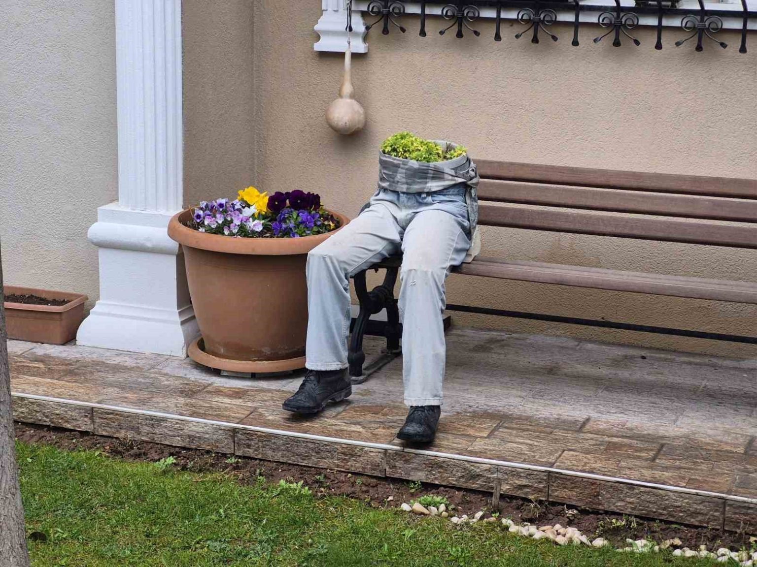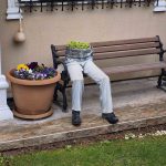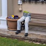 Ertuğrulgazi Mahallesi Şanver Sokak’ta bulunan bir evin bahçesindeki bankın üzerine yerleştirilen dekorasyon göze çarptı. Ayakkabı, pantolon ve saksı birleştirilerek yapılan dekorasyon, sanki bankın üzerinde oturan birisi varmış gibi görüntü oluşturdu. İnsan figürlü saksı, hem ilginç, hem de ürkünç yönüyle çevreden geçenlerin dikkatini topladı.