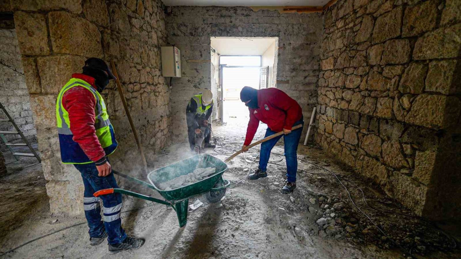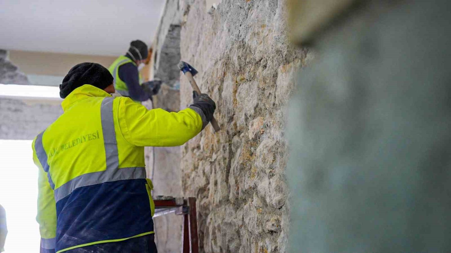 Uzman ekipler, titizlikle sıvaları sökerek tarihi taş dokuyu gün yüzüne çıkarırken binanın özgün mimarisinin korunmasına yönelik çalışmaların devam ettiği bildirildi.