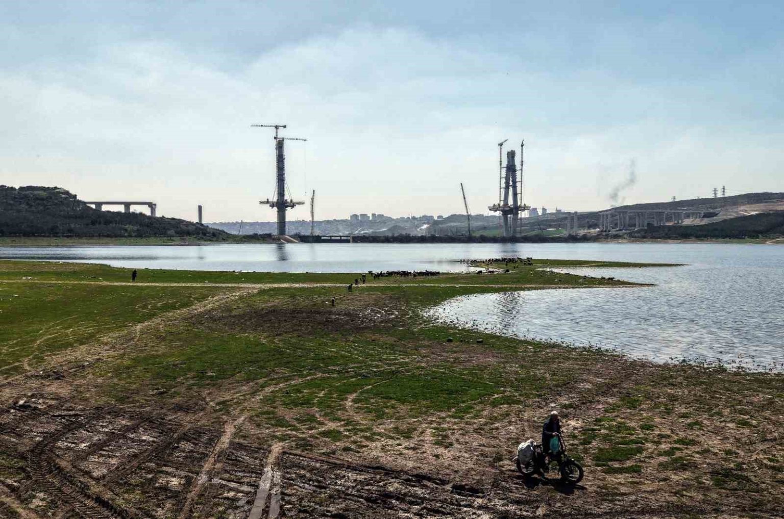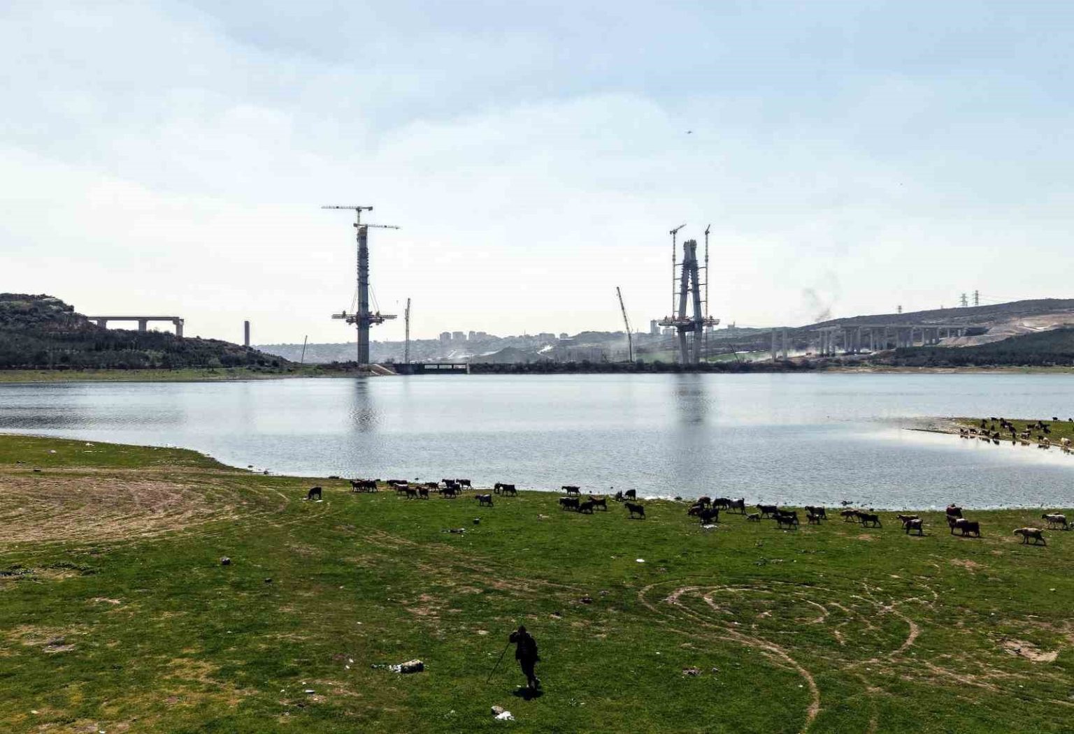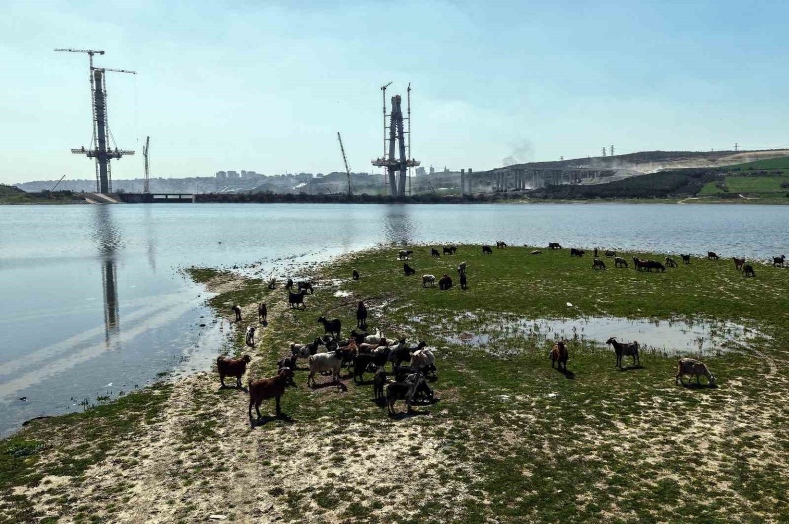 Dron ile kaydedilen görüntülerde, köprünün hemen yanında yer alan merada keçi sürüsünün otlamaya devam ettiği görüldü. Çoban eşliğinde ilerleyen sürü ile yükselen beton kulelerin aynı karede yer alması, bölgedeki dönüşümü çarpıcı şekilde ortaya koydu.