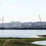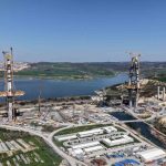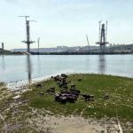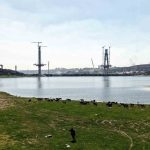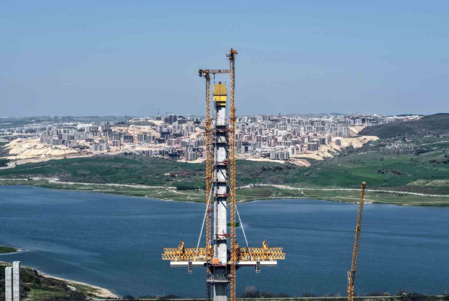 Kanal İstanbul projesi kapsamında inşa edilen 6 köprüden ilki olan Sazlıdere Köprüsü’nde çalışmalar aralıksız sürüyor. Köprü ayaklarının büyük ölçüde tamamlandığı ve tabliye yerleştirme aşamasına geçildiği görülürken, dev vinçlerin eş zamanlı çalışması havadan görüntülere yansıdı. Başakşehir, Kayaşehir ve Bahçeşehir arasındaki ulaşımı sağlayacak köprünün ana açıklığının 440 metre, toplam uzunluğunun ise yaklaşım viyadükleriyle birlikte 1618 metreye ulaşması planlanıyor.