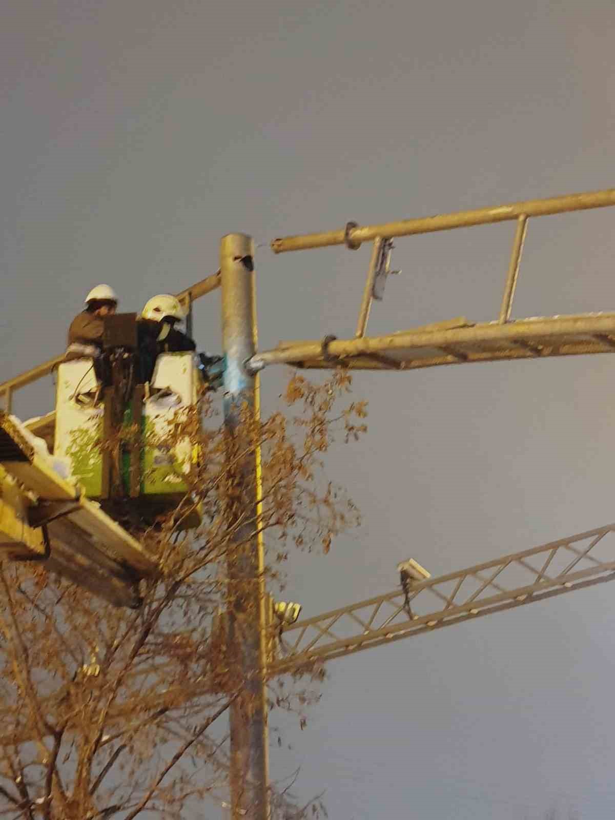 Kamyonun çarptığı trafik levhası itfaiye ekiplerince düzeltildi