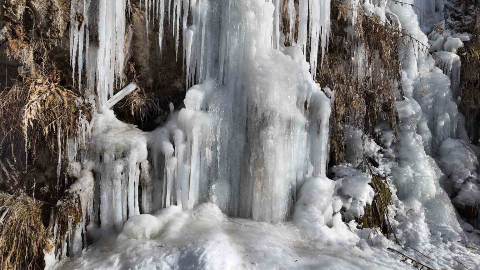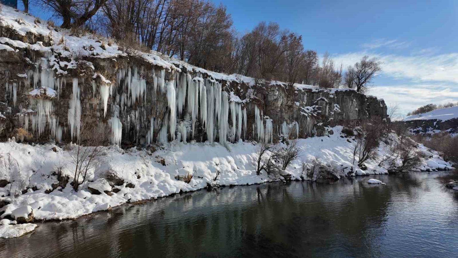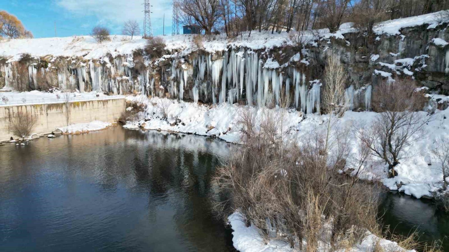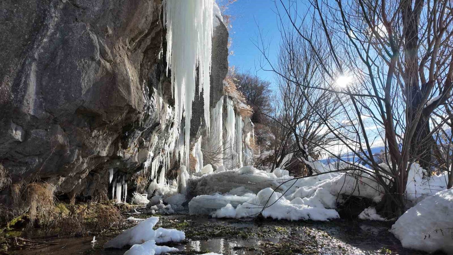 Van’ın Erciş ilçesindeki Koçköprü Kanyonu’nda oluşan metrelerce boydaki buz sarkıtları görsel şölen sunuyor.