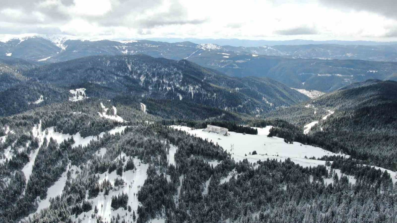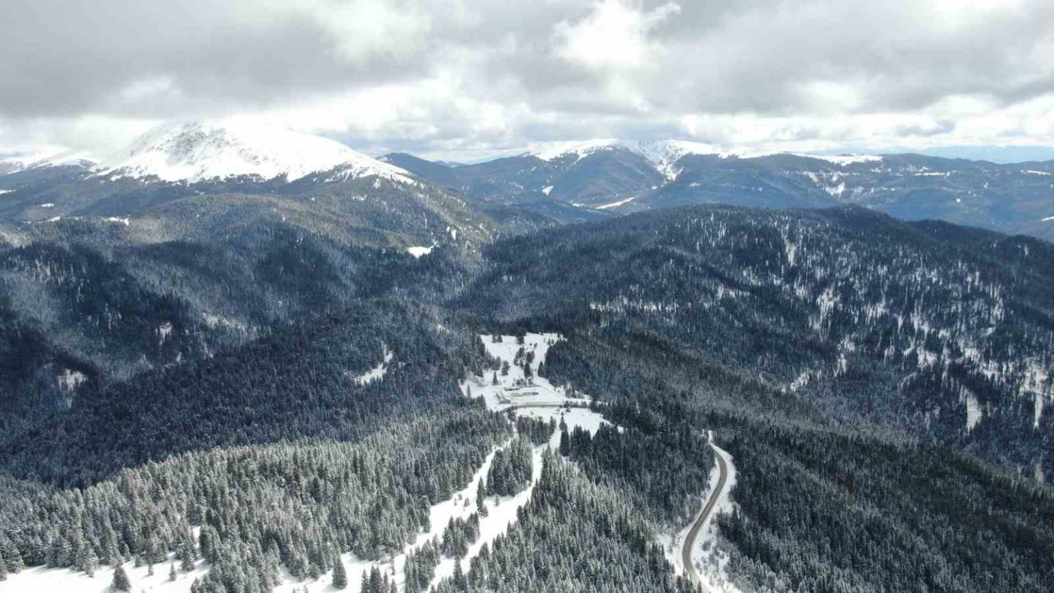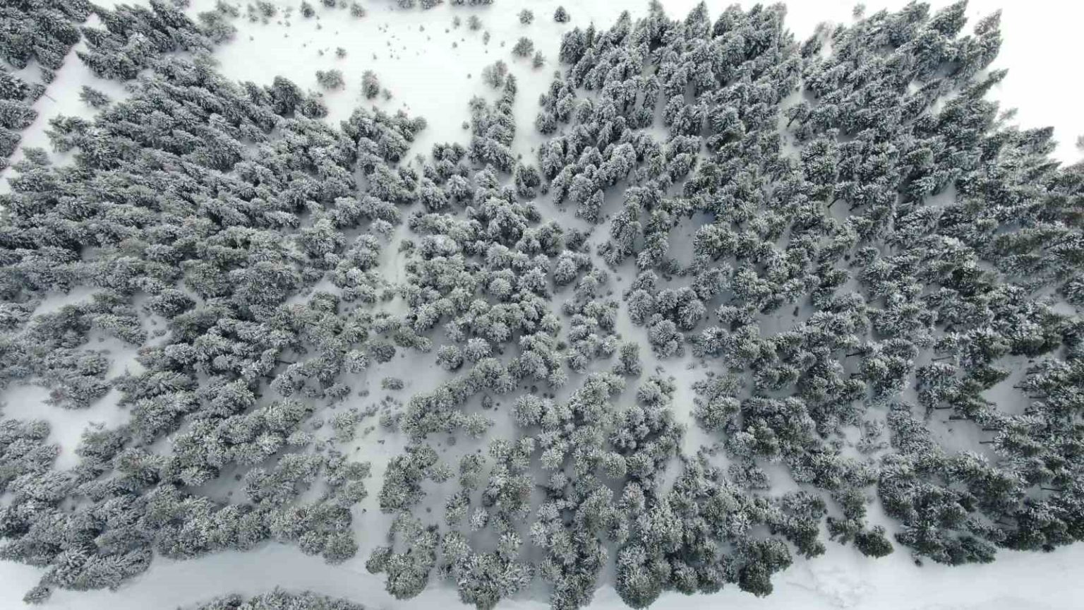 Meteoroloji Müdürlüğü’nün soğuk hava tahmininde bulunduğu Kastamonu’da dün yüksek kesimlerde kar yağışı etkili oldu. Kastamonu ve Çankırı sınırlarında yer alan Ilgaz Dağı Milli Parkı’nda da kar yağışı ara ara etkili olmaya devam ediyor. Kar yağışı sonrasında Ilgaz Dağı beyaz örtüyle kaplandı. Sabah saatlerinde güneşin yüzünü göstermesiyle birlikte Ilgaz Dağı’nın zirvesi ve ormanlık alanlarda kışı aratmayan manzaralar ortaya çıktı. Görsel şölen sunan Ilgaz Dağı, havadan görüntülendi.