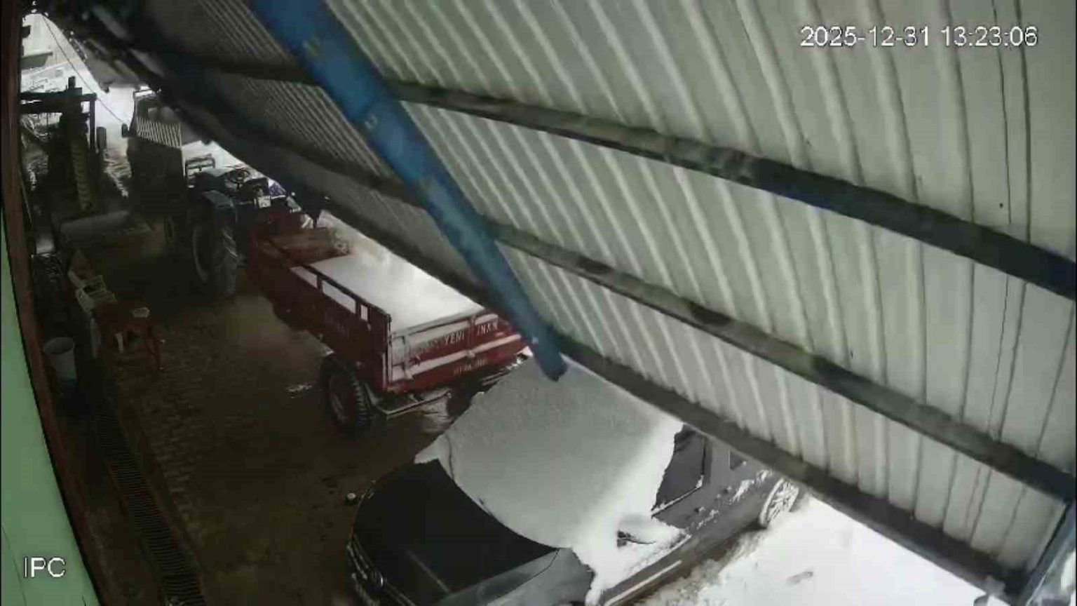 Meteorolojinin şiddetli yağış uyarısında bulunduğu Hatay’da gece saatlerinden itibaren kar yağışı etkili oldu. Şiddetli yağışla birlikte çevre beyaza bürünürken Altınözü ilçesi Mayadalı Mahallesi’nde bulunan zeytinyağı fabrikasının çatısı kar kütlesini taşıyamayarak çöktü. Güvenlik kamerasına yansıyan görüntülerde çatı, park halindeki; traktör, kamyonet ve hafif ticari aracın üzerine devrildi. Olayda yaralanma yaşanmazken, hafif ticari aracın camı zarar gördü.