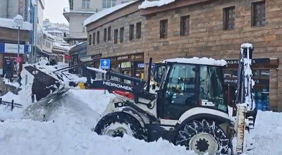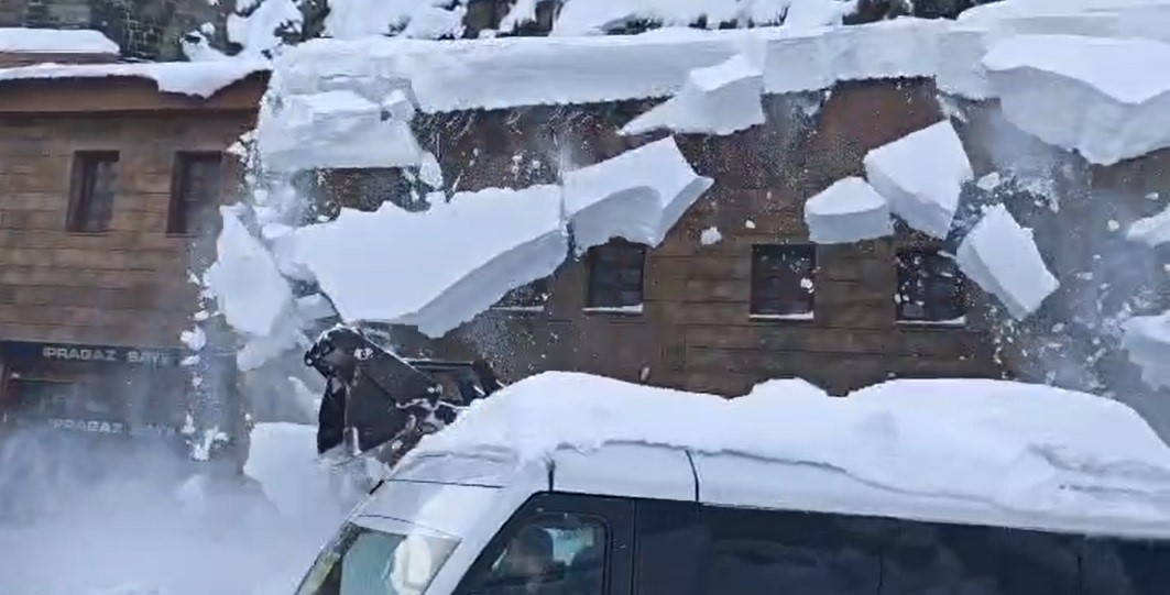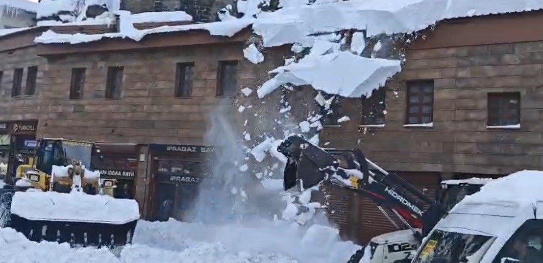Bitlis’te bir binanın çatısında biriken tonlarca ağırlıktaki kar kütlesinin iş makinesinin üzerine düşmesi paniğe neden oldu.