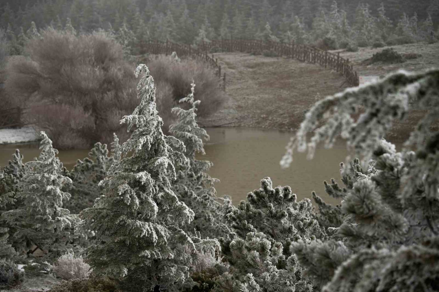 Manisa’nın 1517 metre rakıma sahip Spil Dağı Milli Parkı adeta buz kesti. Gün boyu -6 dereceleri gören ve gece saatlerinde -12’lere varan hava sıcaklıkları nedeniyle ağaçlar, bitki örtüsü ve kayalık alanlar üzerinde kalın bir kırağı tabakası oluşturdu. Kar yağışının beklenen düzeyde gerçekleşmemesi nedeniyle beyaz örtü bu kez karla değil, tamamen don ve buzlanmayla meydana geldi.
