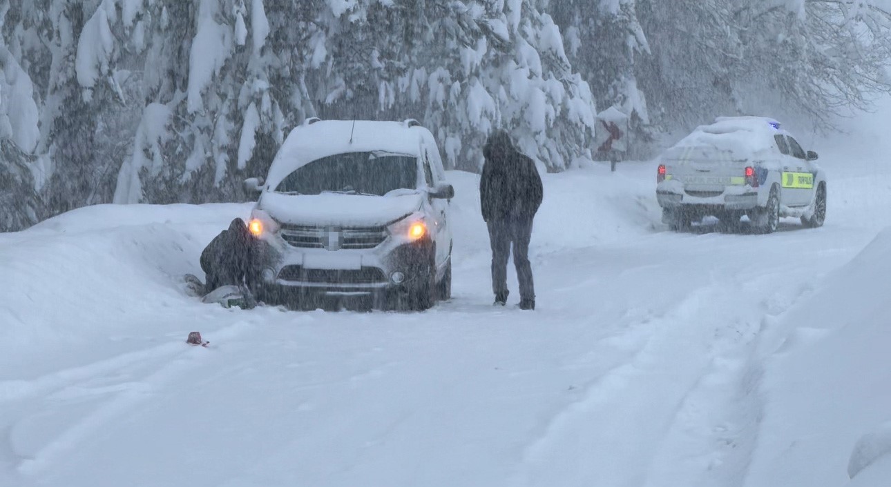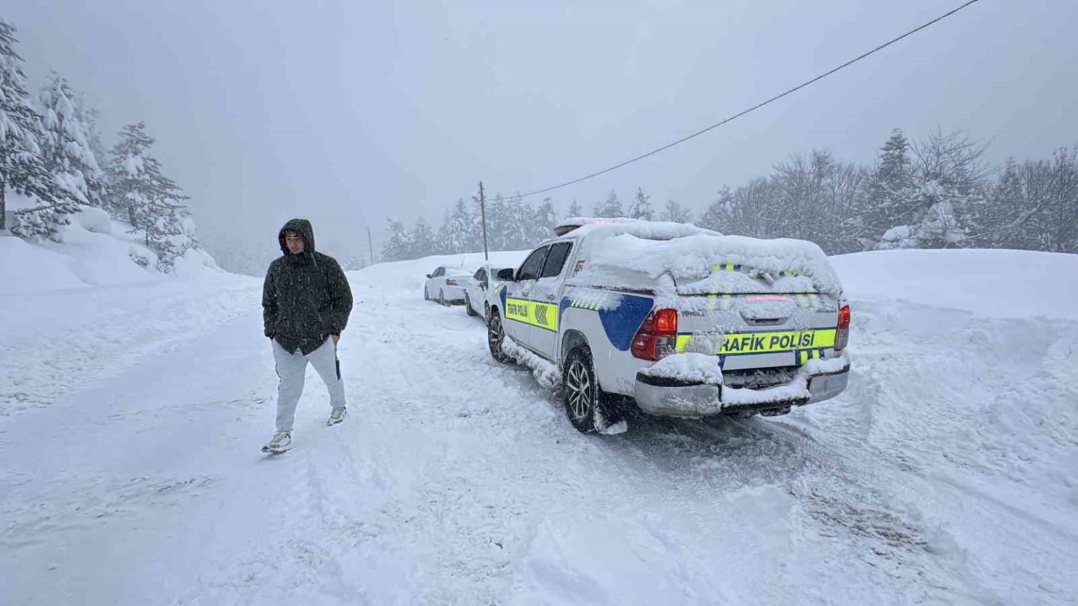 İl Emniyet Müdürlüğü Trafik Şube ekipleri de bin 30 rakımlı Ahmetusta mevkisinde denetim yaparak sürücülere zincir kullanımı ve takip mesafesi konusunda bilgilendirmede bulunuyor.