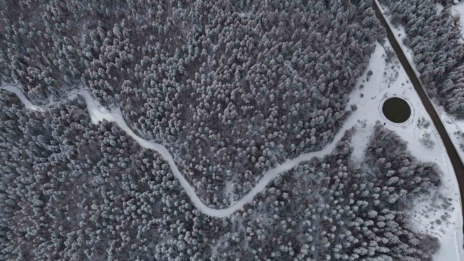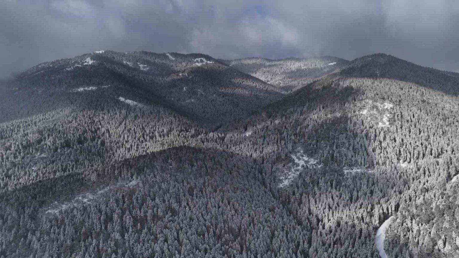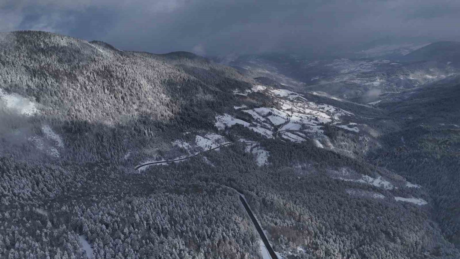 Karabük’te kar yağışıyla beyaz örtüyle kaplanan tarihi konakların çatıları ve ormanlar dronla görüntülendi.