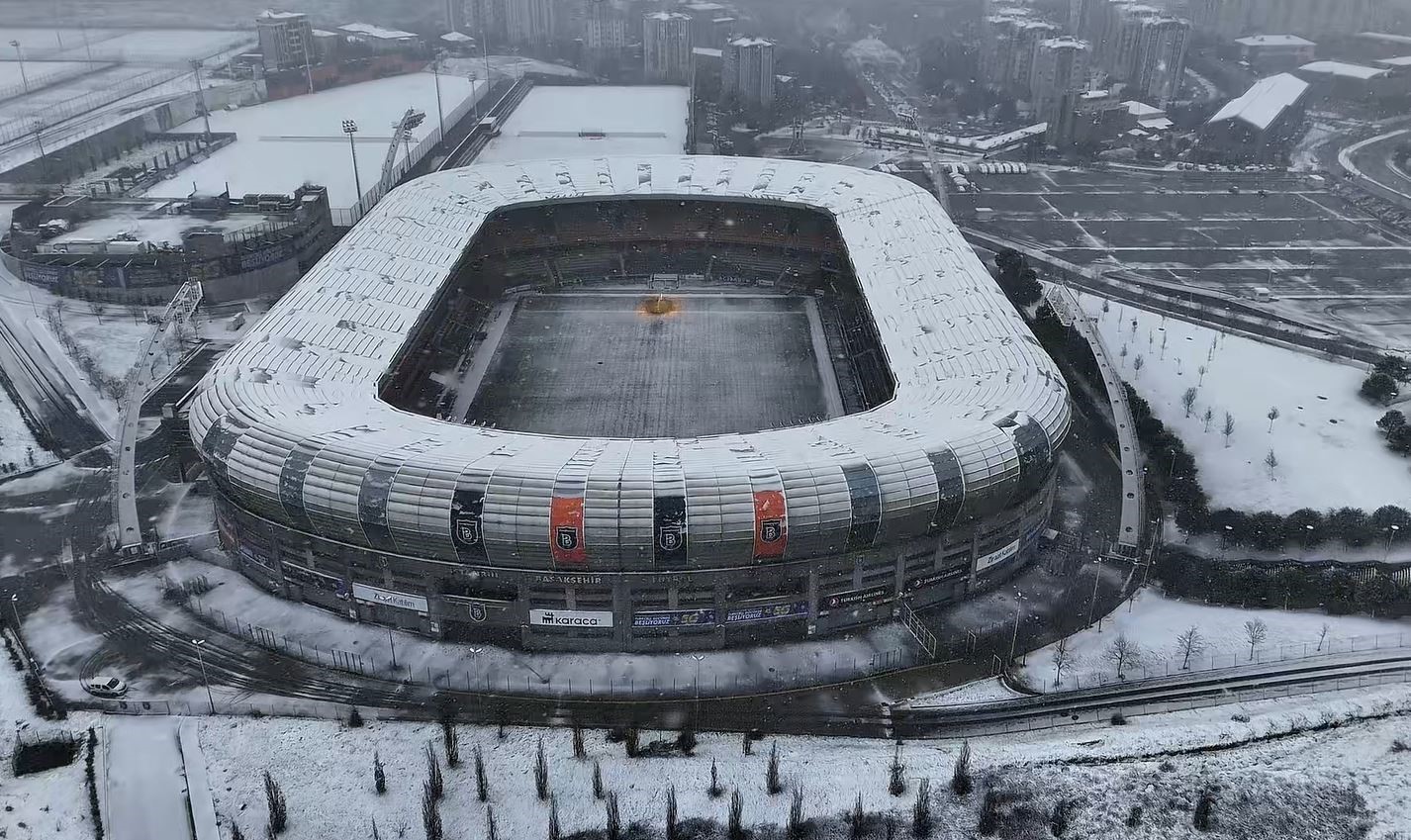 İstanbul’un Başakşehir ilçesinde kar yağışı havadan görüntülendi. Kartpostalık görüntüde stadyum, evler ve yerlerin karla kapandığı görüldü.