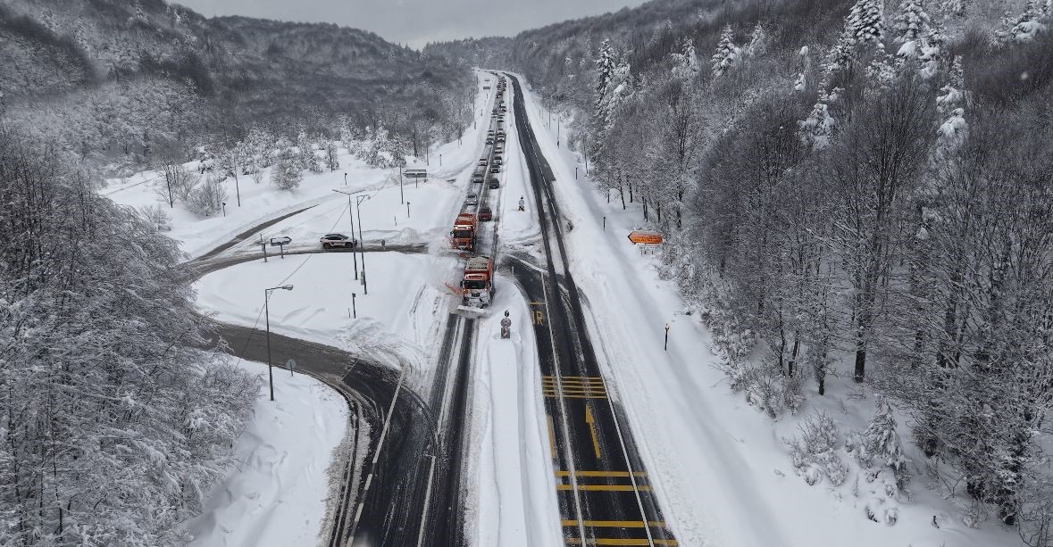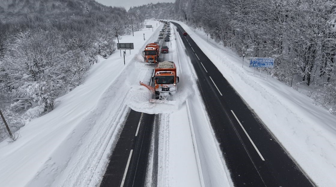 Türkiye’nin en önemli geçiş güzergahlarından D-100 karayolunun Bolu Dağı kesiminde etkili olan kar yağışı sonrası Karayolları ekipleri, yolun kapanmaması için seferber oldu. ’Kar kaplanları’ olarak adlandırılan ekiplerin, beyaz örtüyle kaplanan yolu ulaşıma açık tutmak için yürüttüğü hummalı çalışma havadan görüntülendi.