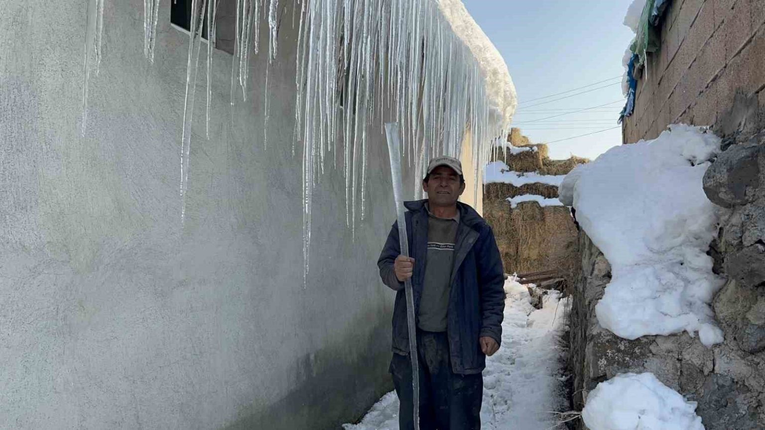 Köy sakinlerinden Murat Aydın, çatıdan kopardığı buz kütlesiyle birlikte yaşanan soğuğu anlattı. Buzun uzunluğunun neredeyse kendi boyuna ulaştığını belirten Aydın, yaşanan kış şartlarının oldukça ağır geçtiğini söyledi.