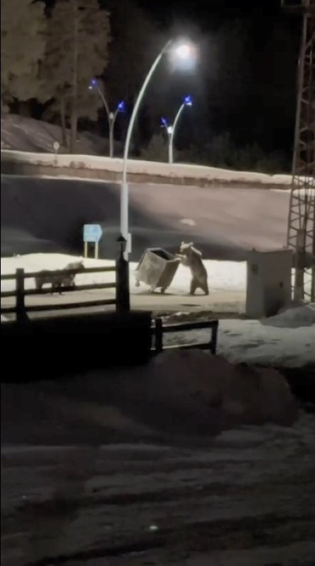 Kış uykusundan uyanan anne ayı ve yavruları, yerleşim yerine gelerek çöp konteynırlarını karıştırmaya başladı. Etrafı dikkatlice kontrol eden anne ayı çöp konteynerini çekerek devirdi. Daha sonra bir poşeti alarak uzaklaştı. O anda bölgede bulunan vatandaş ise anne ayı ve yavrularını cep telefonuyla kaydetti.
