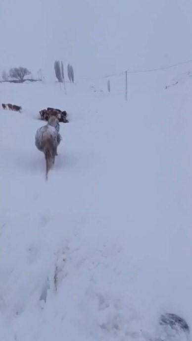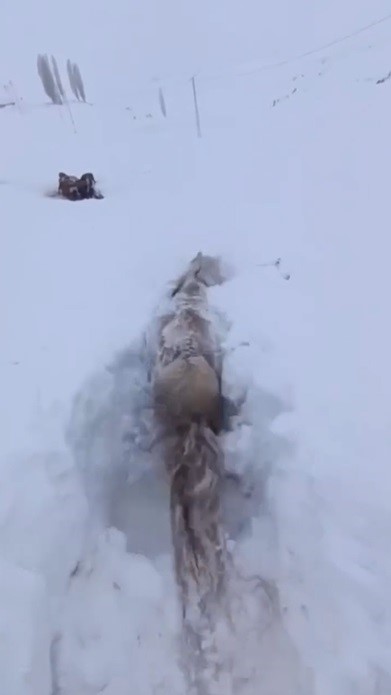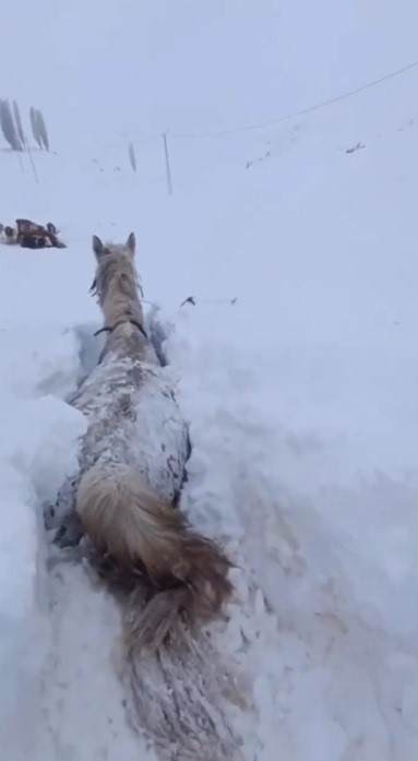 Kars’ın Arpaçay ilçesine bağlı Hasançavuş köyünde bir vatandaşın cep telefonu kamerasına yansıyan görüntülerde; atın göğüs hizasına kadar yükselen karın içinde mahsur kaldığı görülüyor. İlk başlarda hareket etmekte zorlanan ve kara gömülen atın kendi çabasıyla mahsur kaldığı yerden çıkması yer alıyor.