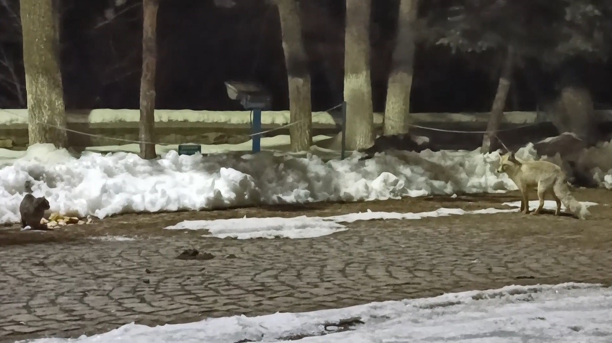 Kars’ta olumsuz hava şartları yaban hayatı etkilemeye devam ediyor. Karla kaplı arazilerde yiyecek bulmakta zorlanan kızıl tilkiler, kent merkezine indi. Kent merkezinde bir vatandaşın bıraktığı yiyecekleri yiyen kediye bir süre sonra kızıl tilki yaklaştı. Yiyeceğe yaklaşmak isteyen tilkiyi fark eden kedi bir anda savunma pozisyonu alarak tüylerini kabarttı. Kedinin kararlı tavrı karşısında tilki de tüylerini kabartarak bir süre bekledi.