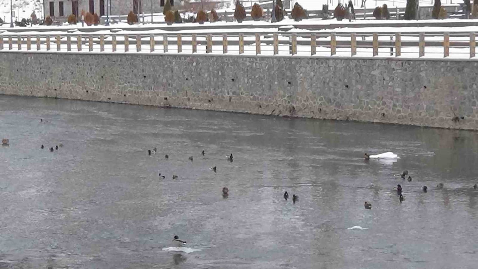 Kars’ta dondurucu soğuklar ve yoğun kar yağışı yaban hayatını olumsuz etkilemeye devam ederken, doğanın en zarif üyelerinden olan Yeşilbaş yaban ördekleri, yiyecek bulmakta zorlanınca soluğu Kars şehir merkezinde aldı.