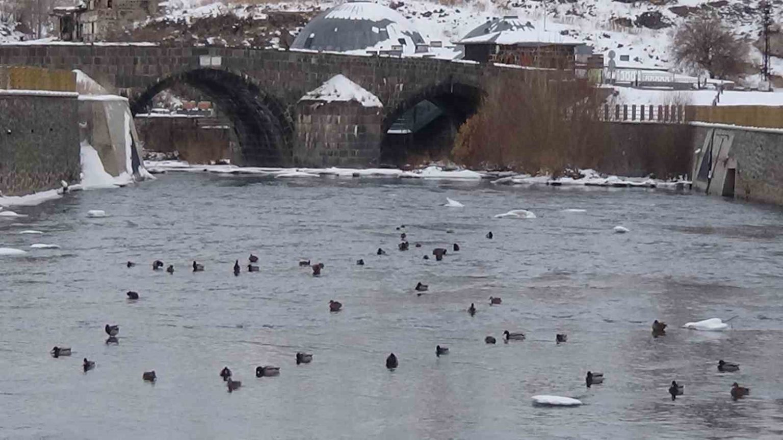Hava sıcaklığının sıfırın altında 13 derece de seyrettiği kentte, akarsuların büyük bölümünün donmasıyla birlikte yaşam alanları daralan ördekler, besin arayışlarını yerleşim yerlerine kadar taşıdı. Kars Çayı’nın buz tutmayan bölümlerinde görülen ördekler, çevredeki vatandaşların ve objektiflerin ilgi odağı oldu.