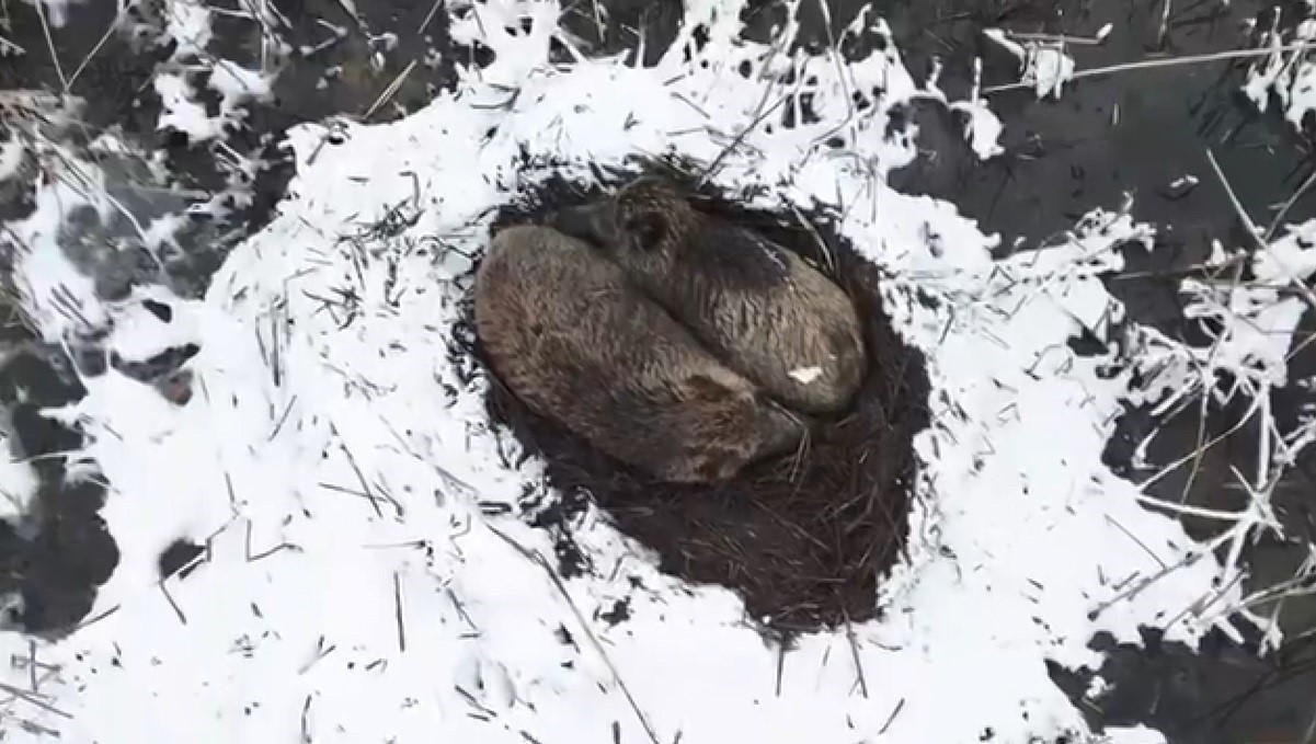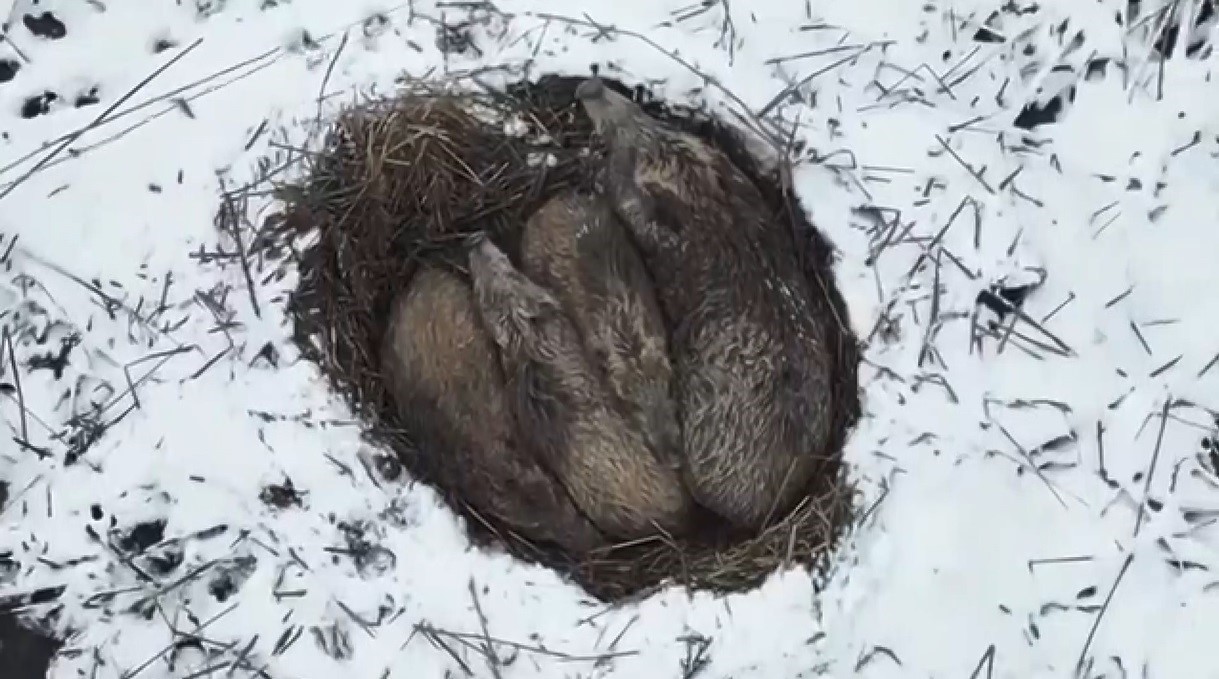Kars’ın dondurucu soğuğuna ve yaban hayatının sert şartlarına rağmen, bir domuz ailesinin yumak halinde toplu uyku anları, dron çekimiyle kaydedilirken ortaya çıkan görüntüler, doğa belgesellerini aratmadı.