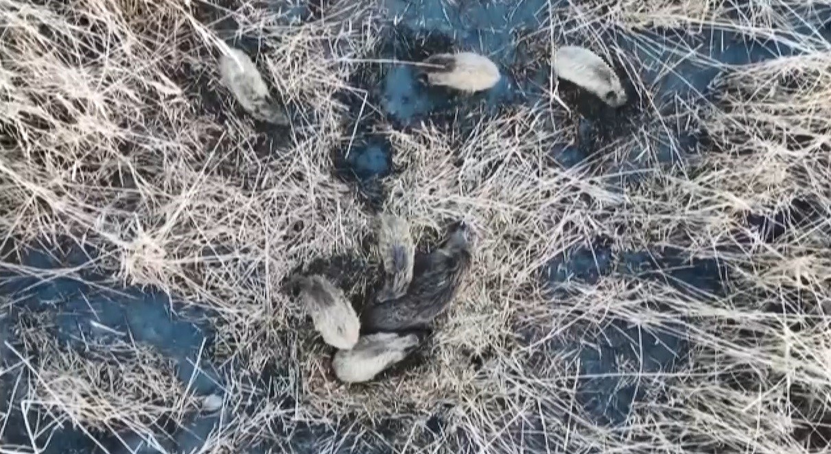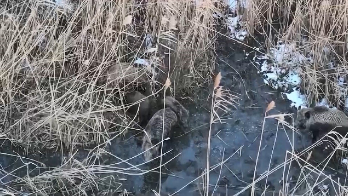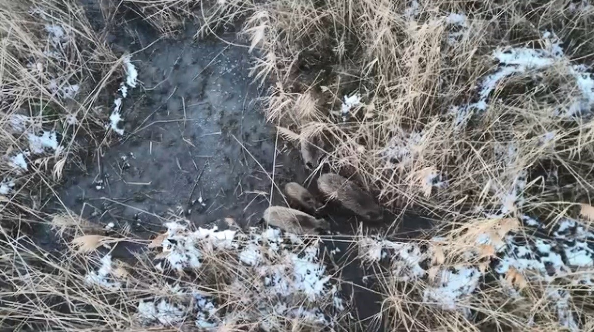 Kars’ta bir gölün etrafında bulunan sazlıkların arasında anne domuz, yavrularının bir kısmıyla yumak halinde uyurken, diğer yavruların ise sazlıkların içerisinde yiyecek araması dron ile anbean kaydedildi.