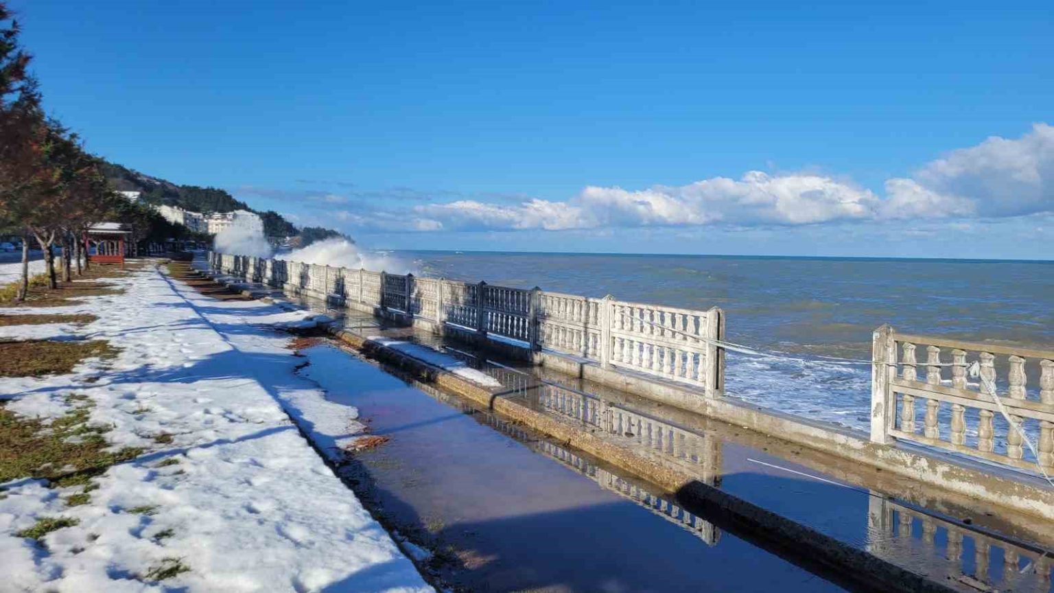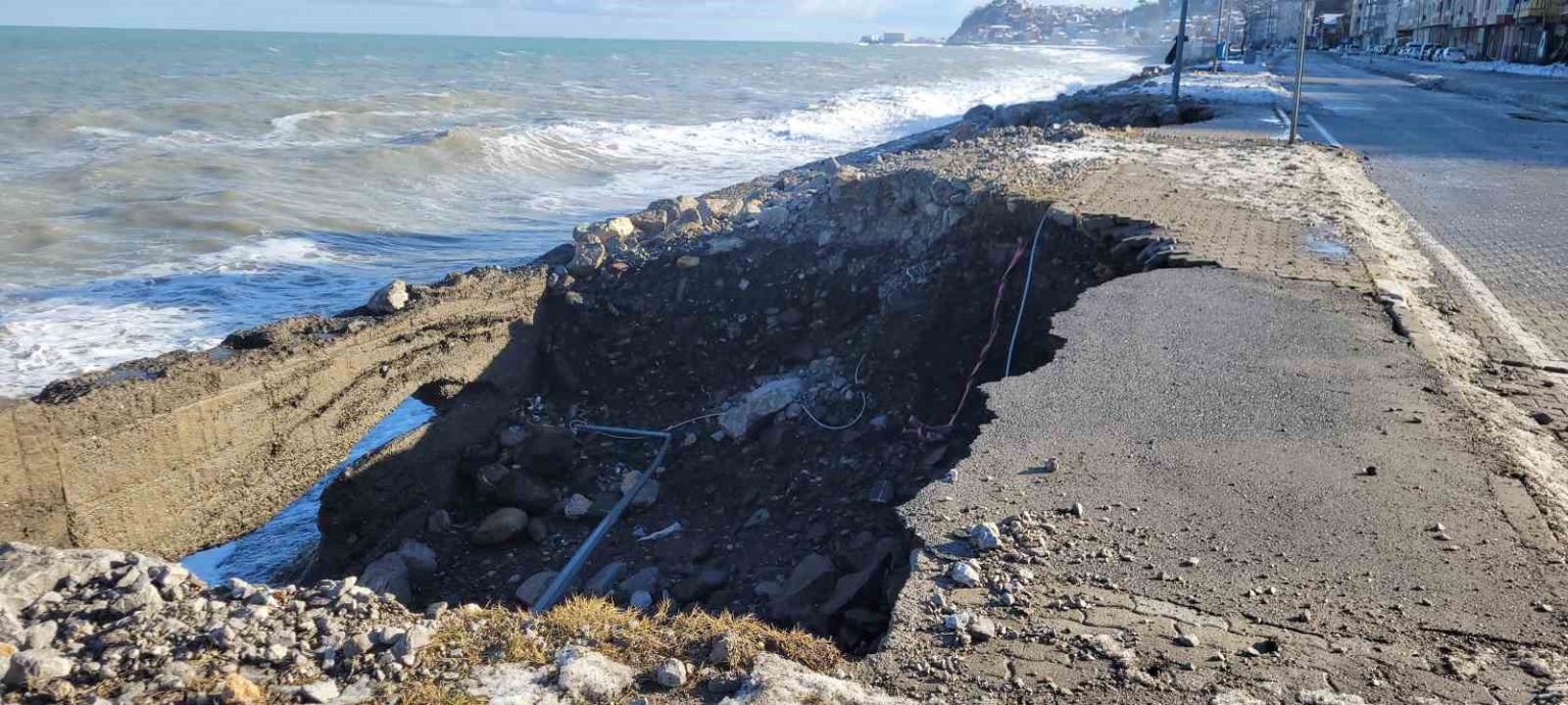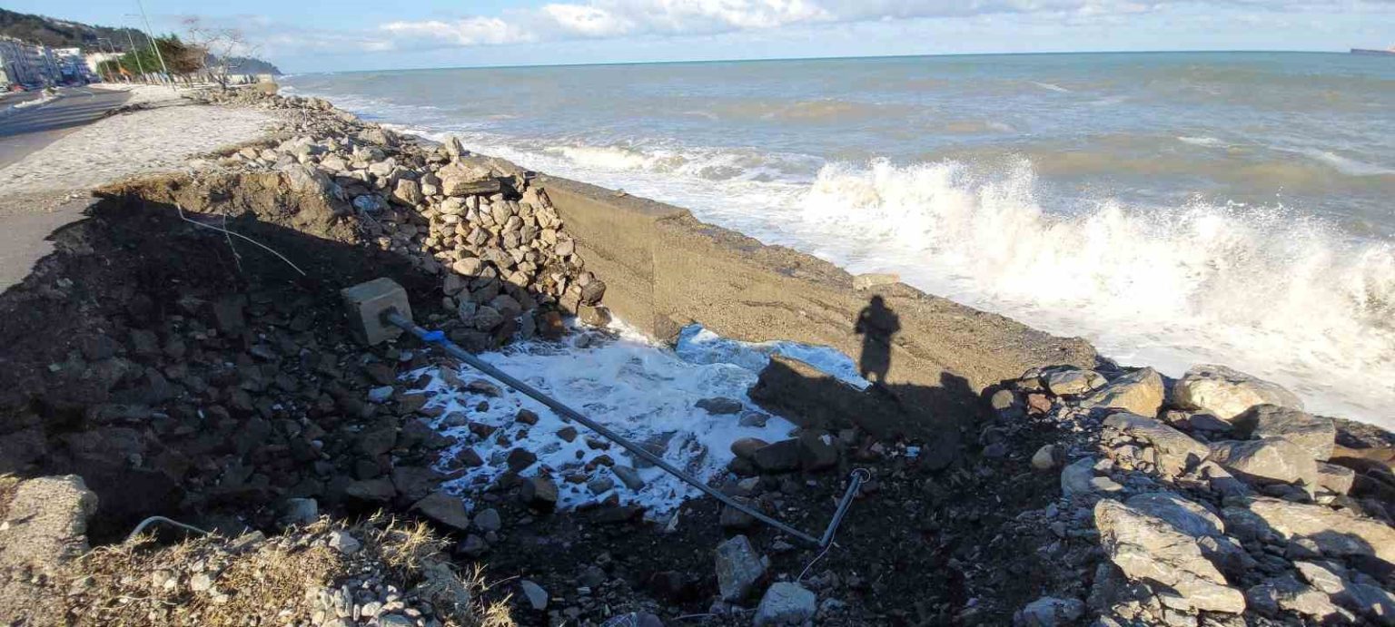 Kastamonu’nun İnebolu ilçesinde kar yağışının ardından etkili olan kuvvetli rüzgar, denizde dalgaların oluşmasına sebep oldu. Dalgaların dövdüğü sahil şeridindeki kaldırımlarda hasar meydana geldi. Bazı noktalarda kaldırımlarda göçükler oluştu.