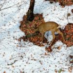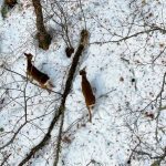 Kastamonu’nun Şenpazar ilçesinde kar yağışı sonrası beyaz örtüyle kaplanan ormanlık alanda yiyecek arayan iki karaca, havadan görüntülendi.