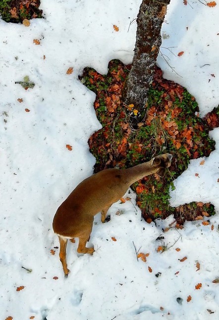 Kar yağışı sonrasında doğadaki manzarayı görüntülemek isteyen Kubilay Onurcan Çalık, ormanlık alanda çekim yaptığı sırada yiyecek arayan iki karacayı fark etti. Karla kaplanan arazide sessizce ilerleyen karacalar, hem yiyecek aradı hem de buldukları yiyecekleri tüketirken dron ile görüntülendi.