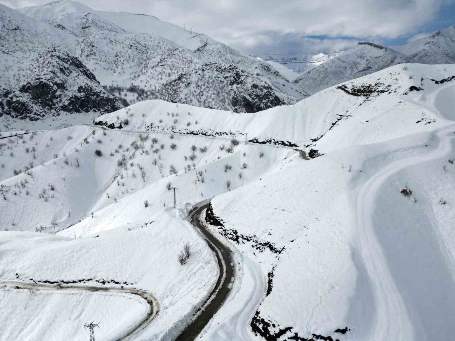 Şırnak’ta kar yağışıyla beraber 3 bin rakımlı Kato Dağı ve yılanlı yollar beyaza büründü. Dağ ve yolun oluşturduğu görsel şölen, seyrine doyumsuz manzaralar ortaya çıkardı.