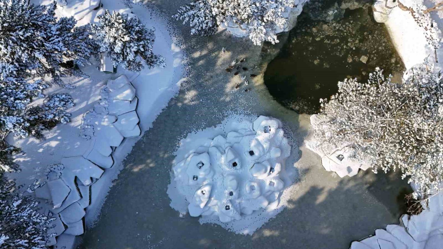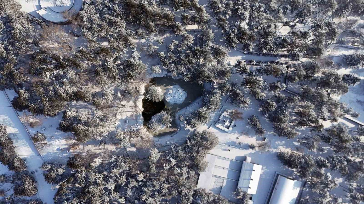 Kayseri’de dün etkili olan kar yağışının ardından sabah saatlerinden itibaren soğuk hava etkisini gösterdi. Sabah saatlerinde termometreler eksi 14’ü gösterirken, kentte buzlanmalar oluştu. Beştepeler Mesire Alanı’nda bulunan doğal gölette soğuk havadan nasibi alarak buz tuttu. Göletin üzerinde bulunan kaz ve ördekler görsel şölen oluştururken, karla kaplanan yeşil ağaçların altındaki gölet havadan görüntülendi.