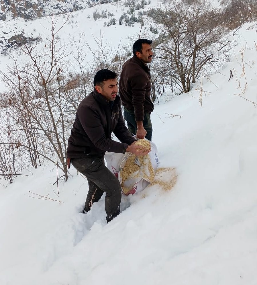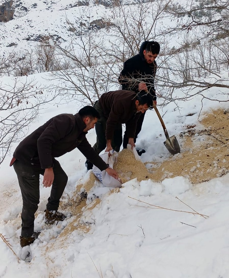 Erzincan’ın Kemah ilçesinde, ağır kış şartları nedeniyle yiyecek bulmakta zorlanan yaban hayvanları için doğaya yem bırakıldı.