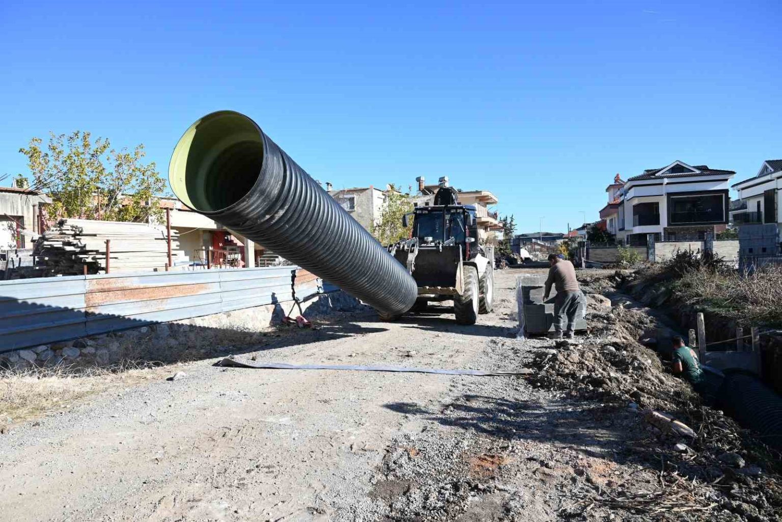 Kuzdere Mahallesi 38. Cadde’de 350 metrelik imar yolunda gerçekleştirilen yol yapım çalışmaları kapsamında 800’lük koruge boru ile yağmur suyu drenaj hattı döşeniyor.