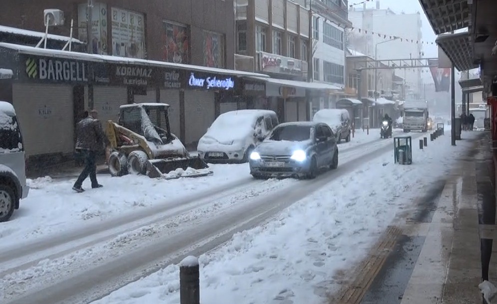 Kilis’te geceden bu yana devam eden kar yağışı, şehir merkezi, sokaklar ve caddeleri beyaza bürüdü.