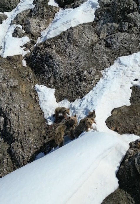 Bingöl’de kış uykusundan uyanarak karla kaplı arazide dolaşan ayı ve üç yavrusu dron ile görüntülendi.