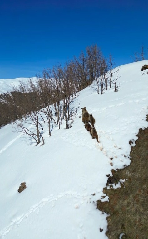 Bingöl’de doğada nadir rastlanan anlardan biri kaydedildi. Kış uykusundan uyanan bir bozayı ve üç yavrusu, karla kaplı arazide dolaşırken görüntülendi. Dron ile doğa gezgini Doğuş Başak tarafından kaydedilen görüntülerde anne ayının yavrularıyla birlikte temkinli şekilde ilerleyip, bir süre sonra gözden kayboldukları görüldü.