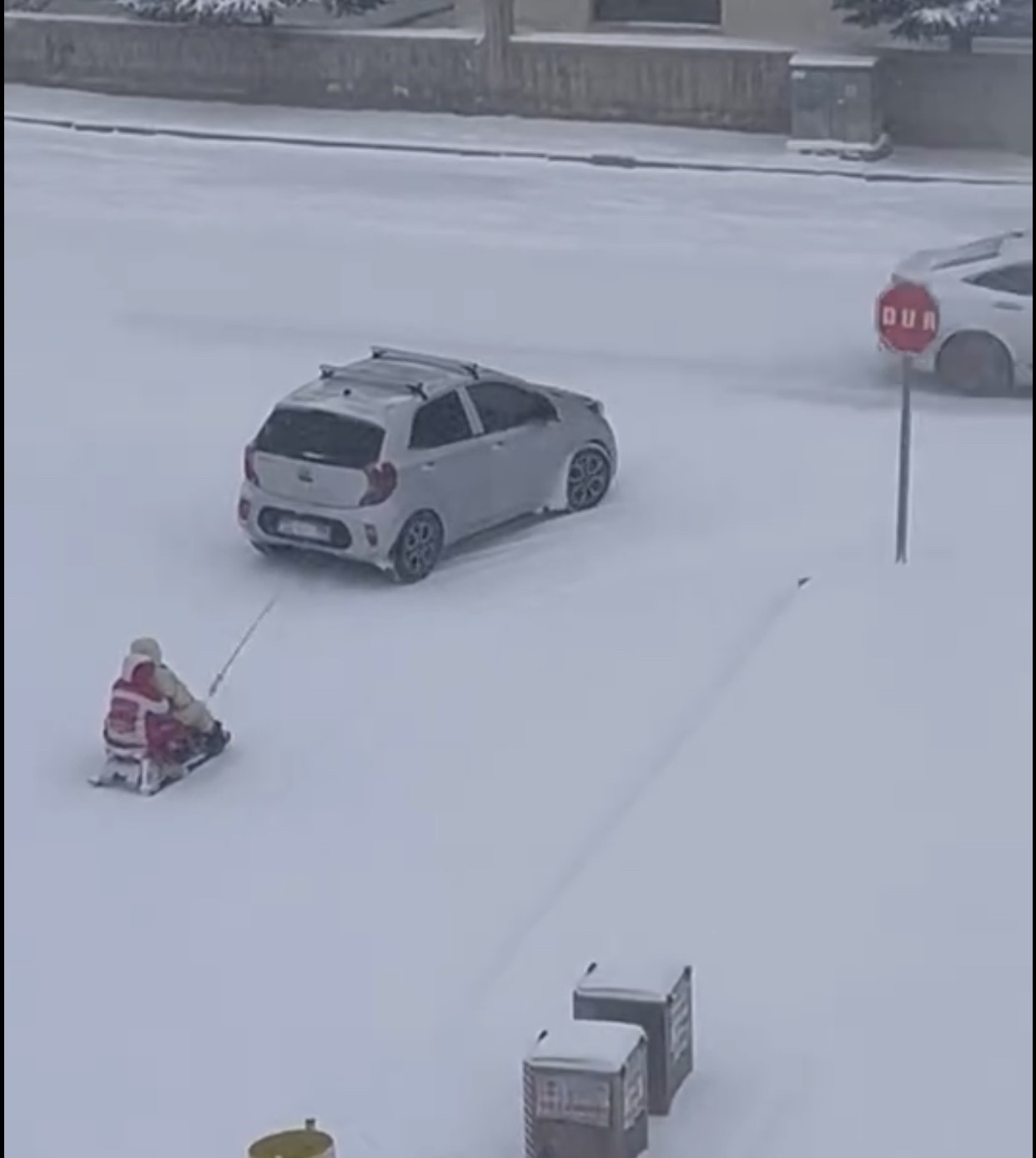 Kızağı araca bağlayıp çektiler, tehlikeli eğlence kameraya yansıdı